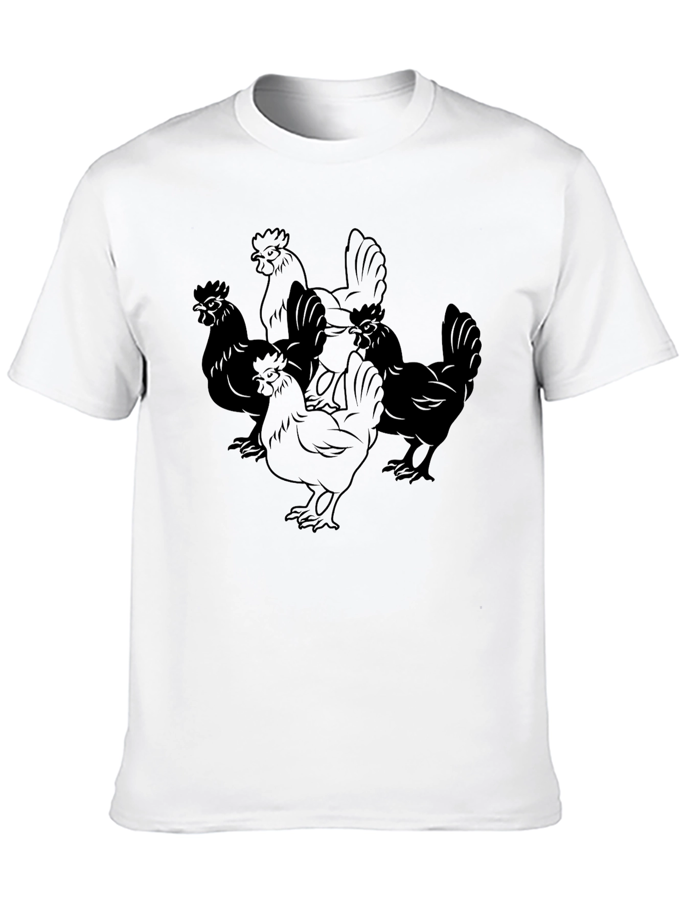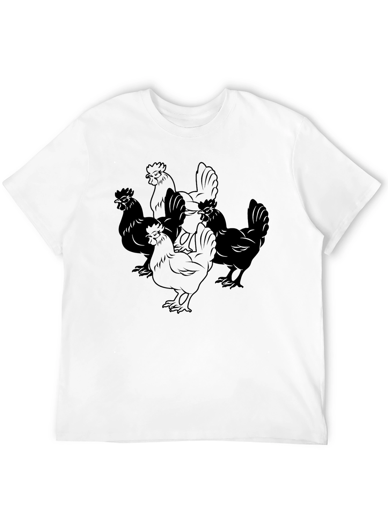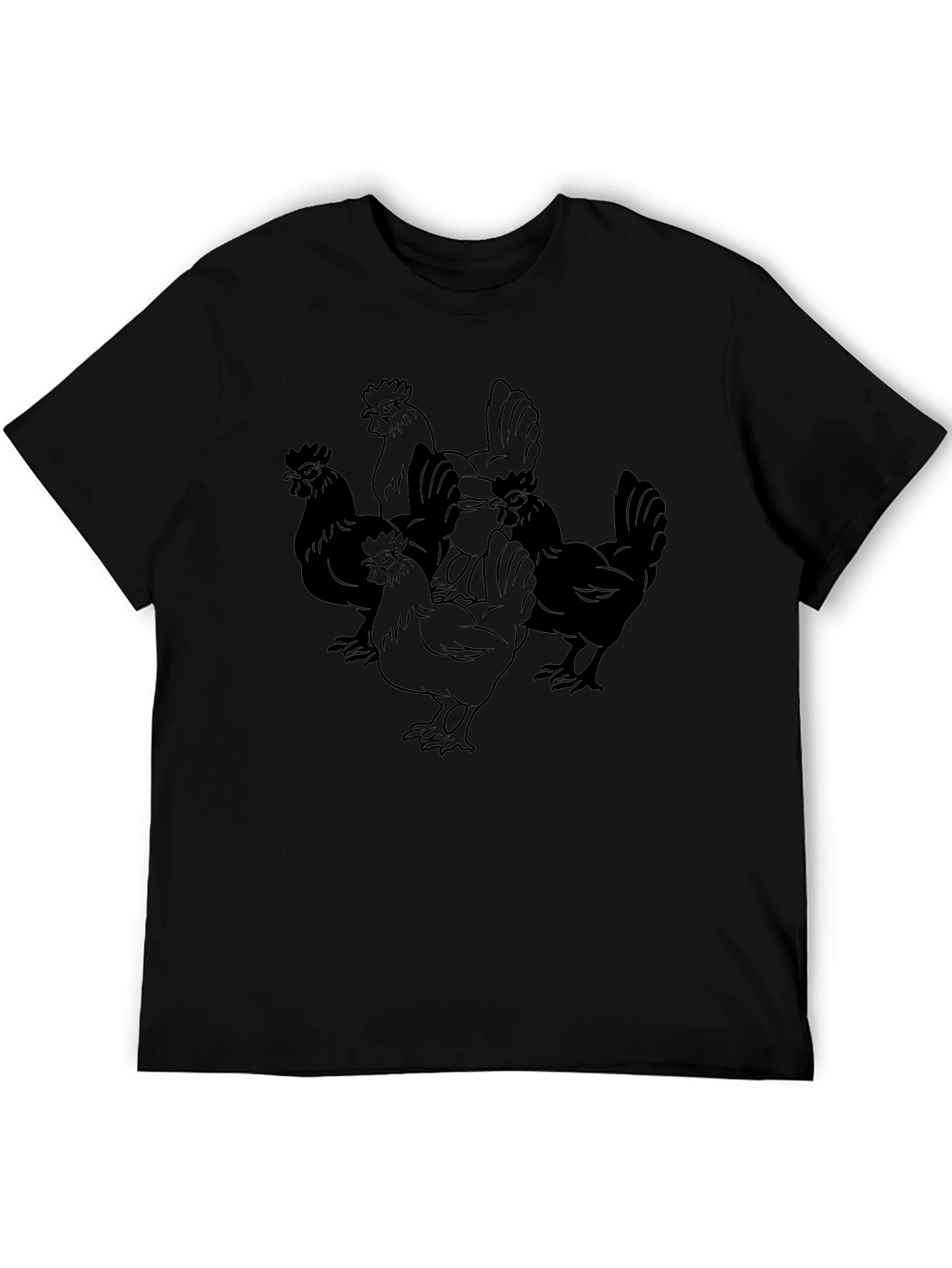 Show off your love for poultry with this stylish black t-shirt! The shirt features a unique graphic design of multiple chickens, making it a fun and eye-catching piece. Made from a comfortable-looking, breathable fabric, this tee is perfect for everyday wear. Its casual style makes it a versatile addition to your wardrobe, easily paired with jeans, shorts, or even layered under a jacket. Ideal for casual outings, weekend adventures, or simply relaxing at home. Get yours today and add a touch of whimsy to your look!