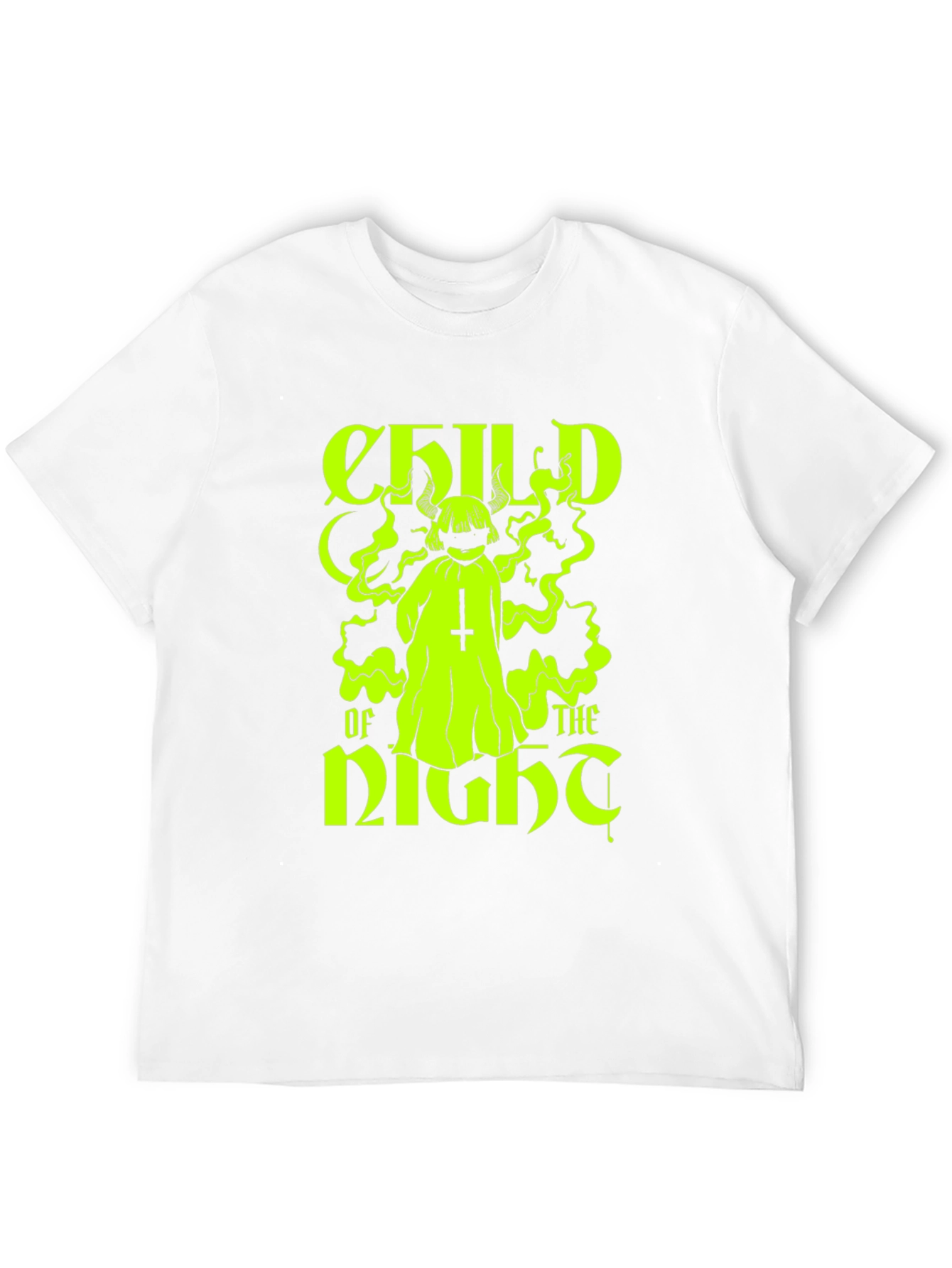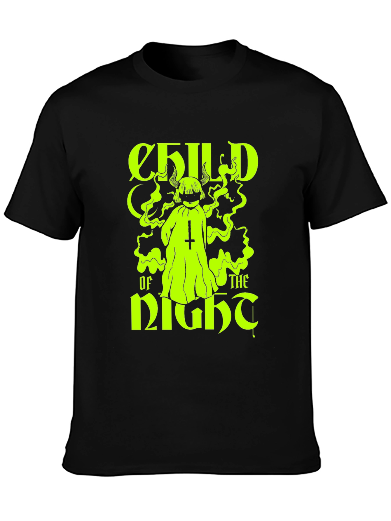 Embrace the night with this striking black T-shirt featuring a bold, neon green graphic. The design showcases a stylized figure with horns and an inverted cross, surrounded by swirling smoke. The text "CHILD OF THE NIGHT" is prominently displayed in a gothic-inspired font, adding to the shirt's edgy aesthetic. Made from a comfortable, lightweight fabric, this tee is perfect for casual wear or making a statement at your next social gathering. Pair it with jeans or shorts for a versatile look. This unique T-shirt is sure to turn heads and spark conversations.