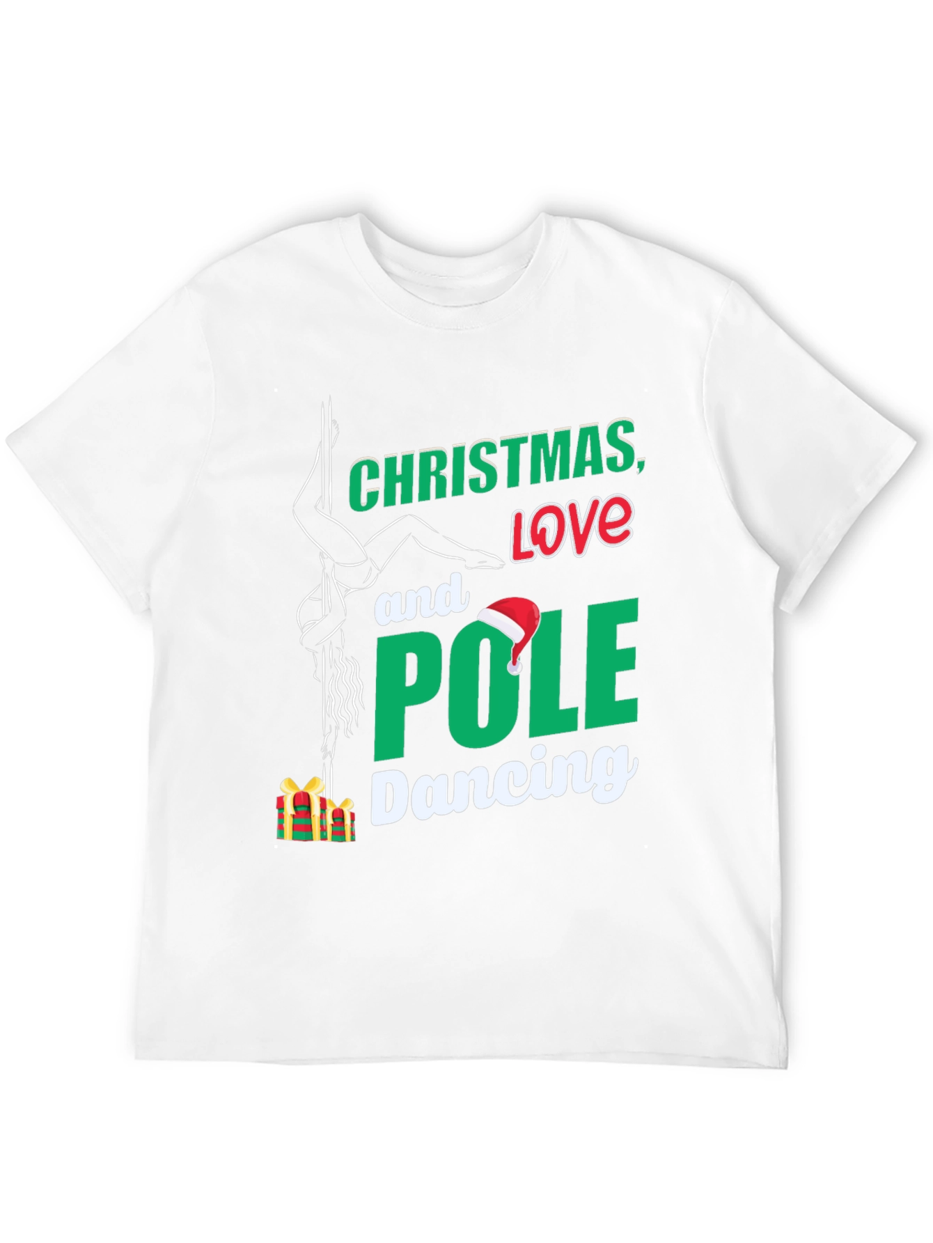 This eye-catching black T-shirt features a fun and festive design perfect for the holiday season. The graphic includes the words "CHRISTMAS, LOVE and POLE Dancing" in a playful, mixed-font arrangement, with "CHRISTMAS" and "POLE" in green and "LOVE" in red, bringing the Christmas vibe. A silhouette of a dancer on a pole, gift box illustrations, and a Santa hat add to the whimsical theme. Made from what appears to be a soft and comfortable cotton blend, this shirt is ideal for casual wear during Christmas festivities or as a unique gift. Show off your love for pole dancing and the holiday season with this conversation-starting T-shirt!