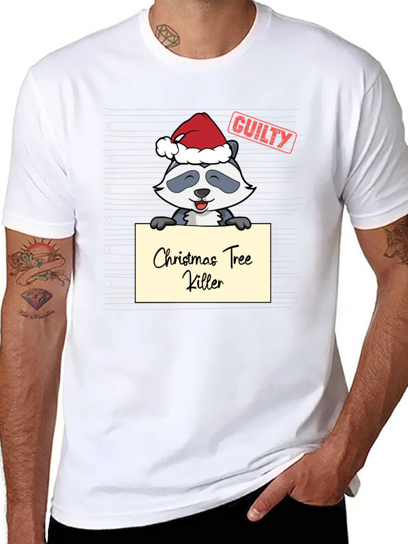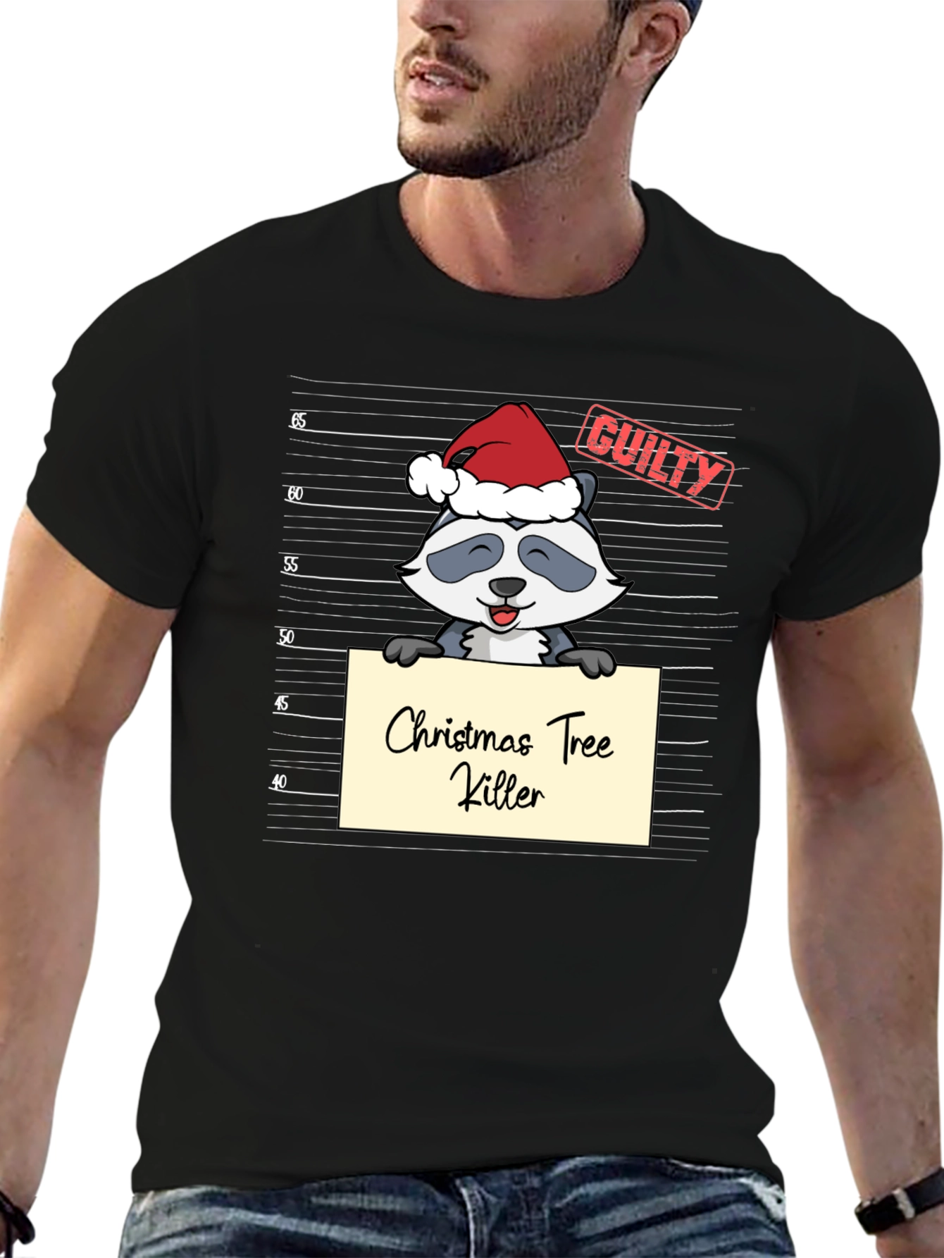 Show off your holiday humor with this unique graphic t-shirt! This black t-shirt features a cartoon raccoon wearing a Santa hat and holding a sign that says "Christmas Tree Killer" in a mugshot style. Above the raccoon is stamped "GUILTY" in red. It's a playful and eye-catching design, perfect for Christmas parties, casual gatherings, or as a fun gag gift for that friend who always has a witty comment. Made from a soft and comfortable fabric, this tee is sure to be a conversation starter wherever you go. Get ready to spread some laughter and holiday cheer with this fun t-shirt!