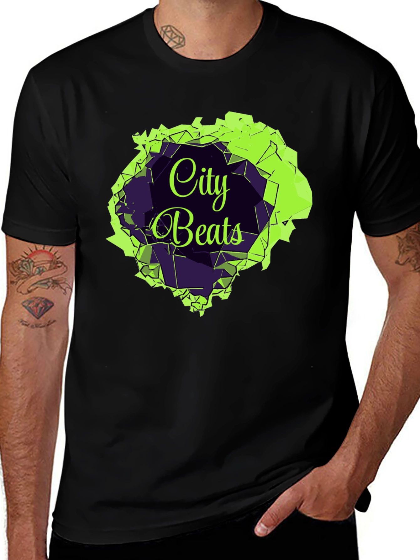 Elevate your casual wardrobe with this striking men's black t-shirt. The bold 'City Beats' graphic features an eye-catching, abstract design with vibrant green and purple geometric shapes, giving it a modern, edgy look. Crafted from a comfortable, breathable fabric, this tee is perfect for everyday wear. Its classic fit ensures a relaxed feel, making it ideal for pairing with jeans or shorts for a laid-back yet stylish outfit. Stand out from the crowd with this unique and trendy piece. A must-have addition to any fashion-forward man's collection, perfect for concerts, casual outings, or just expressing your unique style.