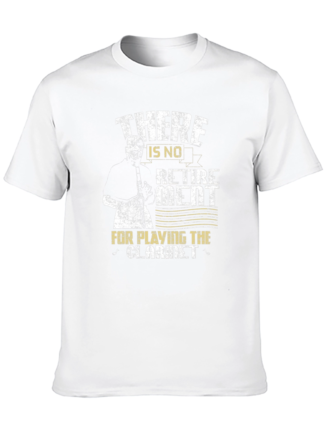 This striking black t-shirt is designed for dedicated clarinet players. The bold graphic features the statement "THERE IS NO RETIREMENT FOR PLAYING THE CLARINET", making it a fun and expressive piece. The shirt displays an image of a clarinetist. Constructed from what appears to be a soft and comfortable cotton blend, it's ideal for everyday wear, music rehearsals, or casual outings. The classic fit and short sleeves add to the garment's appeal and versatility. This shirt makes an excellent gift for clarinet enthusiasts, music teachers, or anyone who appreciates the timeless art of playing the clarinet.