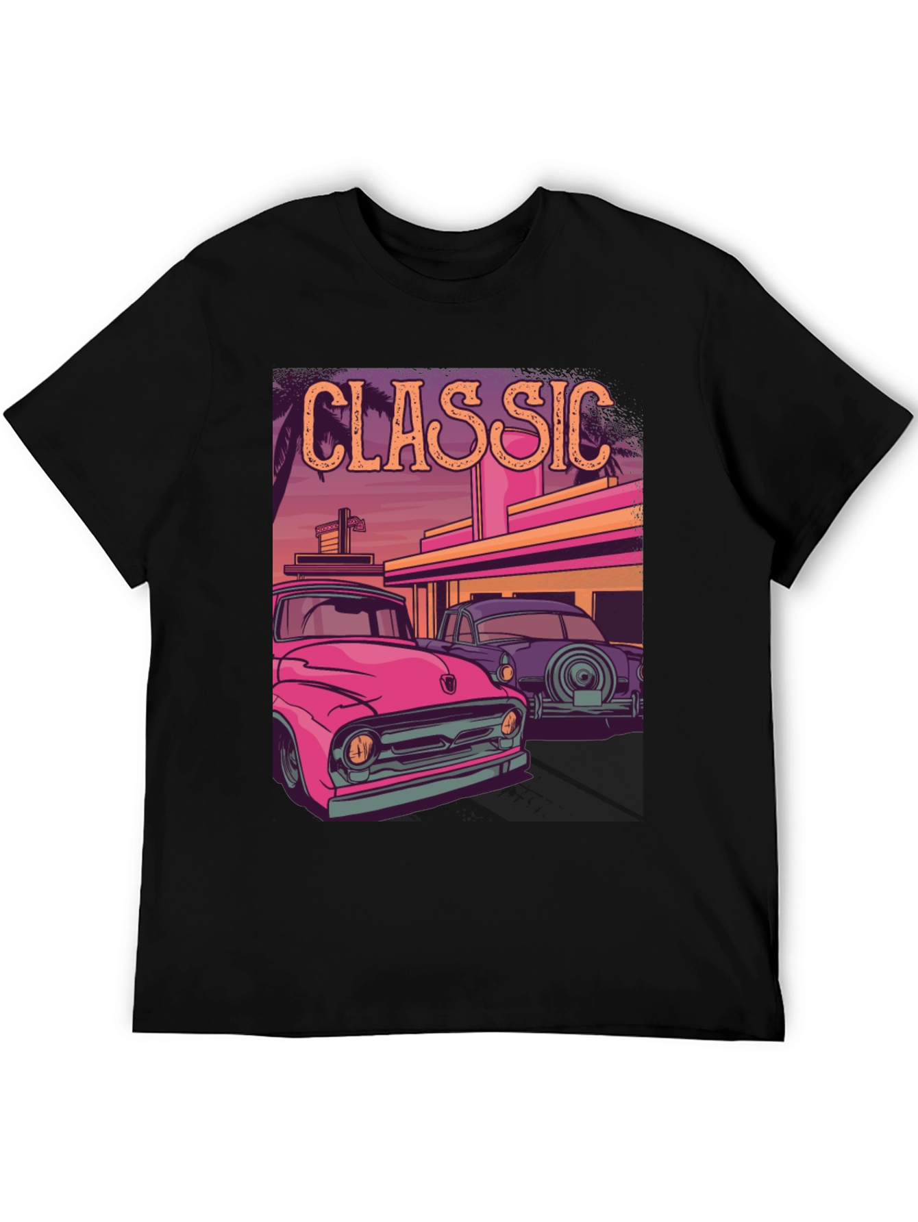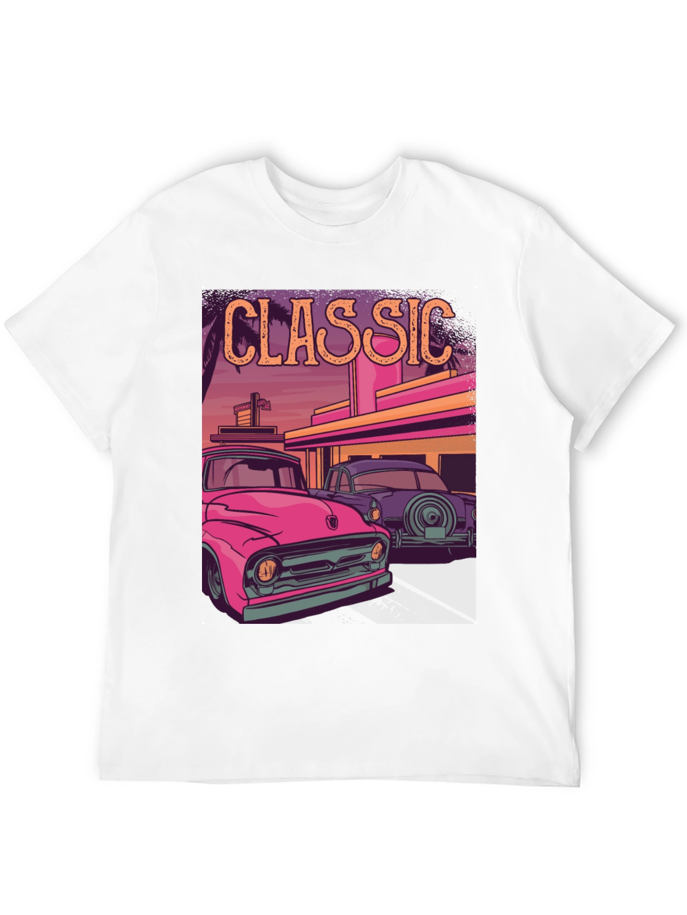 Show off your love for vintage vehicles with this striking graphic tee. The shirt features a vibrant, colorful design showcasing classic cars in a retro setting, complete with palm trees and a vintage-style building. The word 'CLASSIC' is emblazoned above the scene in a retro font. Made from a comfortable, breathable fabric, this tee is perfect for casual wear or showcasing your unique style. Ideal for car enthusiasts and fans of retro aesthetics, it is sure to turn heads. Add a touch of nostalgia to your wardrobe with this must-have tee!