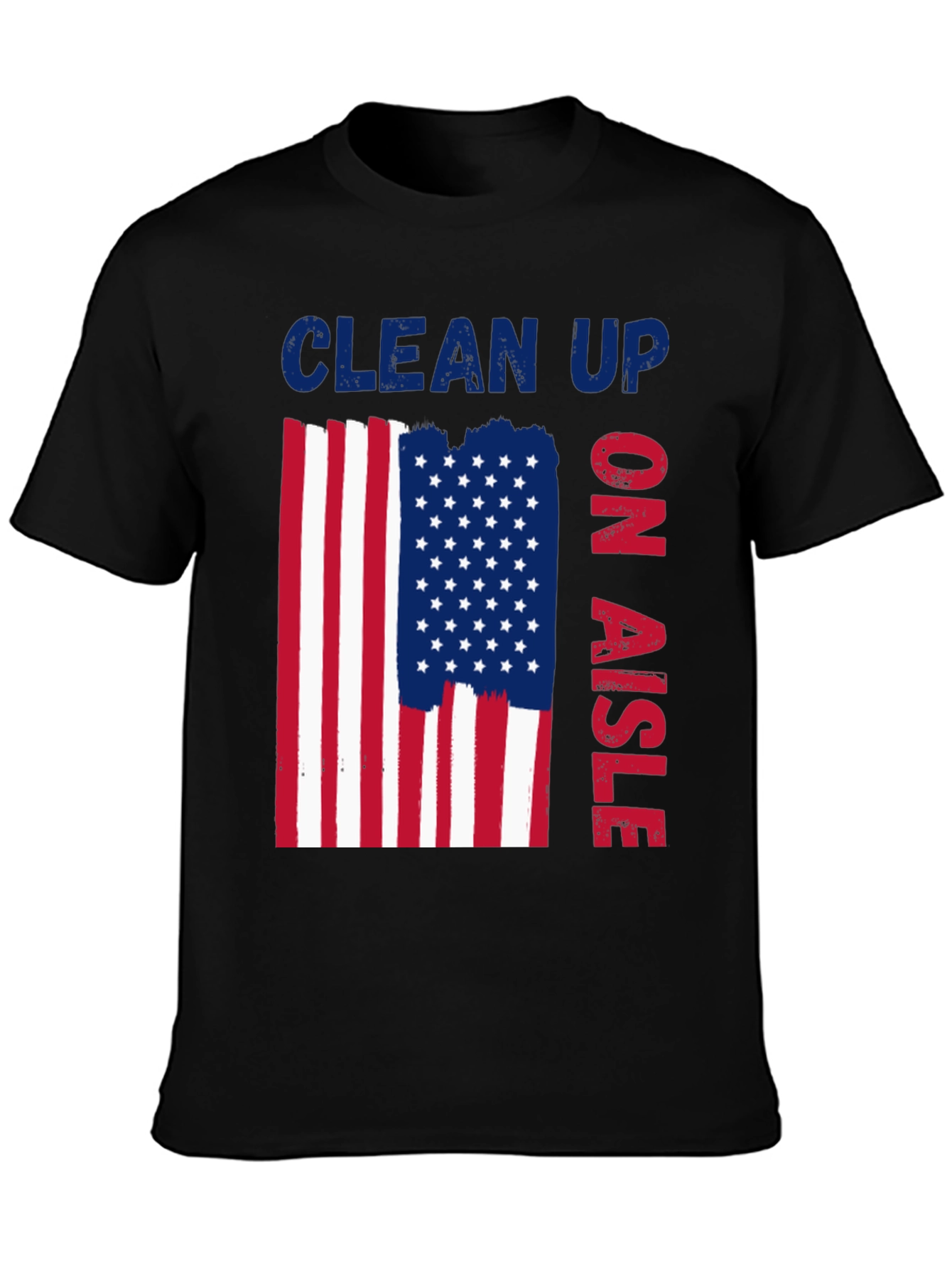 Show your patriotic spirit with this eye-catching black t-shirt! Featuring a distressed American flag design coupled with the cheeky phrase 'Clean Up On Aisle', this tee is sure to spark conversations and garner smiles. The graphic design combines bold red, white, and blue colors for a striking and memorable look. Made from a comfortable and breathable fabric, it's perfect for casual wear, holidays, or even making a statement at your next social gathering. Ideal for anyone who loves American pride with a touch of humor, this shirt is bound to become a wardrobe favorite.