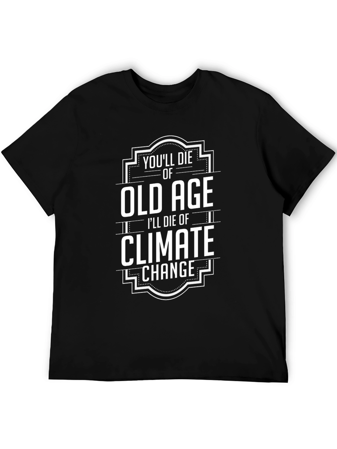 Show your concern for the planet with this statement tee! This black t-shirt features a bold, white graphic design with the text "You'll Die of Old Age, I'll Die of Climate Change." The message is framed by a decorative rectangular outline, making it both stylish and attention-grabbing. Made from comfortable material, this t-shirt is perfect for casual wear, protests, or simply sparking conversations about environmental issues. It's a unique and impactful way to express your views and raise awareness. Get yours today and make a statement!