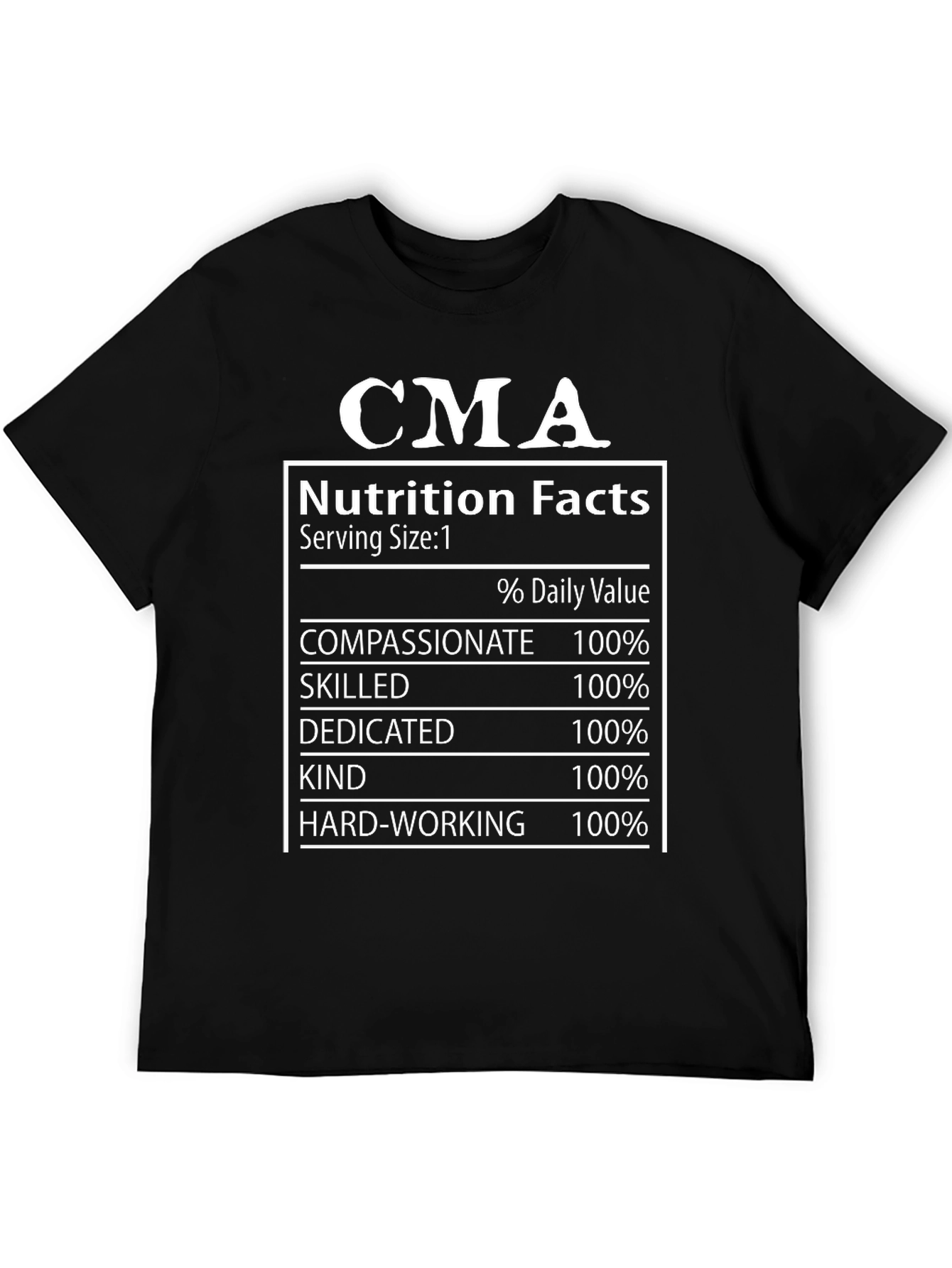 This black t-shirt features a clever and humorous design mimicking a nutrition facts label. Bold white text at the top reads 'CMA' above a 'Nutrition Facts' table. The label lists personality traits such as 'Compassionate,' 'Skilled,' 'Dedicated,' 'Kind,' and 'Hard-Working', each boasting a '100%' Daily Value. This unique tee is perfect for individuals with a great sense of humor who want to showcase their positive qualities in a fun and eye-catching way. Comfortable and stylish, it's ideal for casual wear, social gatherings, or as a thoughtful gift.