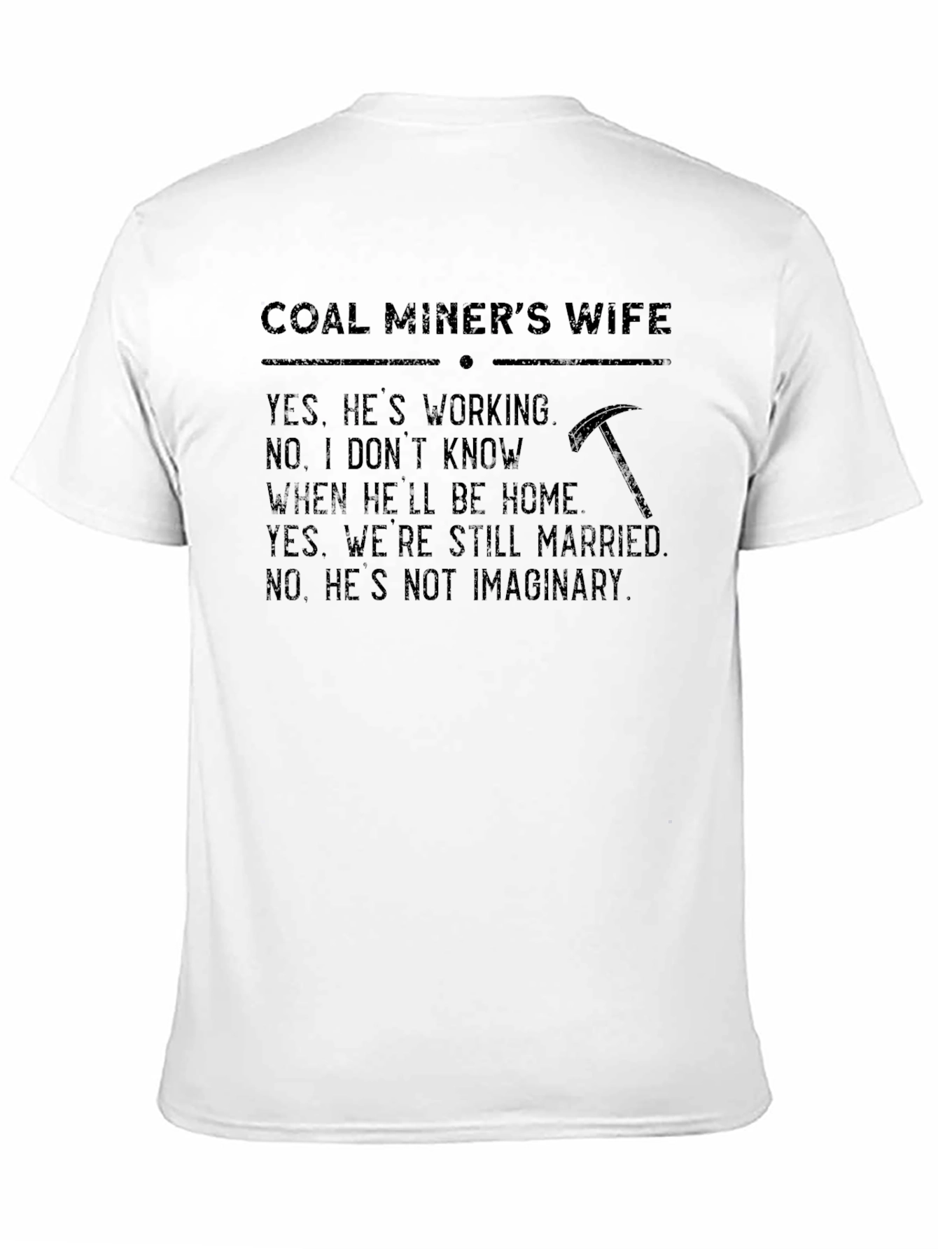 Show your support with this bold graphic tee! The black shirt features the phrase "Coal Miner's Wife" followed by humorous sayings about the life of a coal miner's spouse. Made from comfortable, breathable fabric, this tee is perfect for everyday wear. The classic fit looks great on anyone. Wear it to work, casual outings, or while running errands. It's a great conversation starter and a fun way to show pride in your family's profession. Get yours today and let everyone know you're a strong and supportive Coal Miner's Wife!