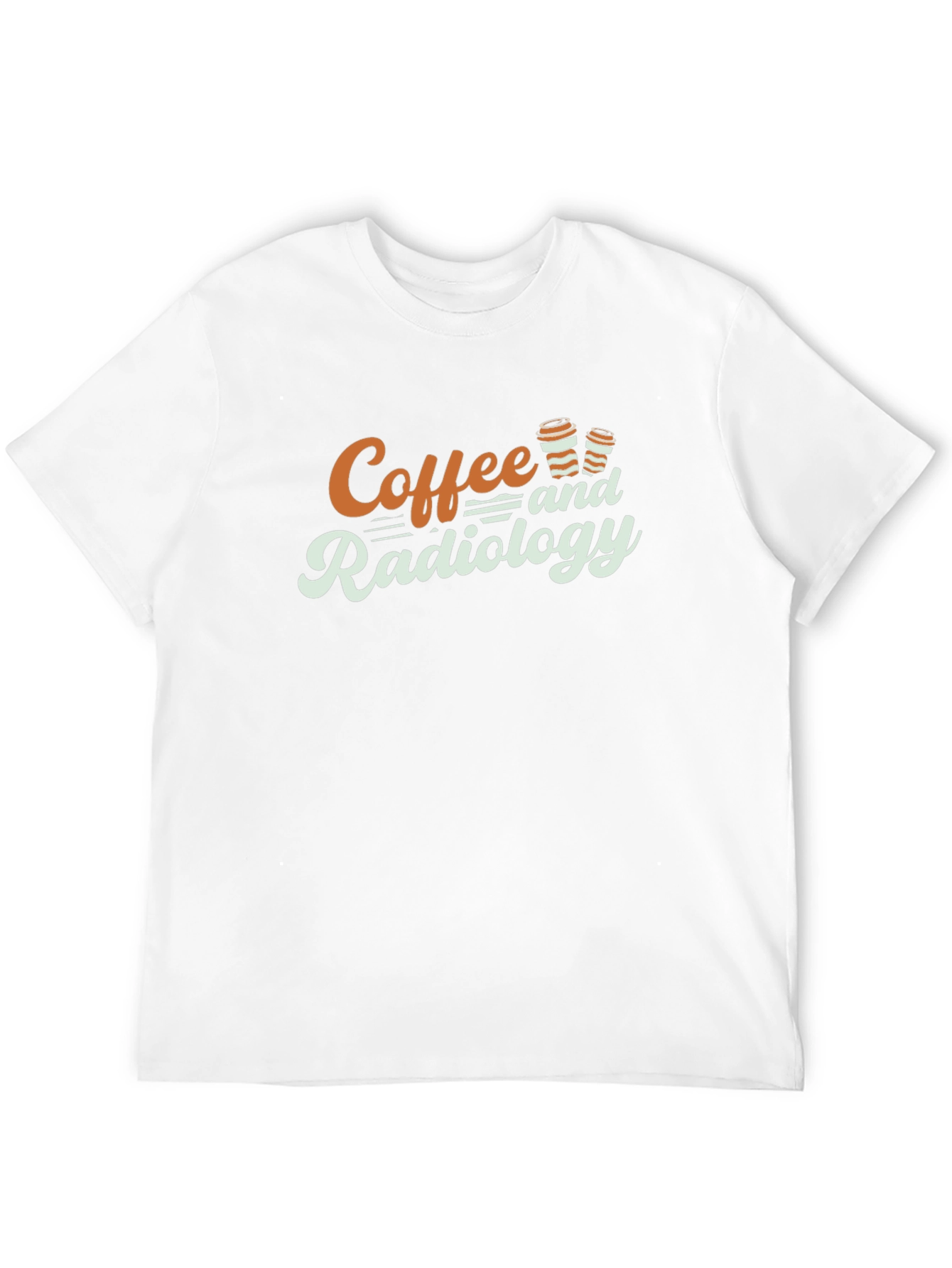 This stylish black t-shirt features a fun graphic design with the words "Coffee and Radiology" in a playful font. The word "Coffee" is in a vibrant orange color, while "Radiology" is in a light seafoam green, offering a visually appealing contrast. Above the word "and" there are 2 cups of coffee. Made from a comfortable-looking material, this shirt is perfect for casual wear and expressing your interests. It's ideal for radiologists, medical professionals, coffee lovers, or anyone with a quirky sense of humor. Wear it to work, school, or any casual occasion to add a touch of personality to your outfit.