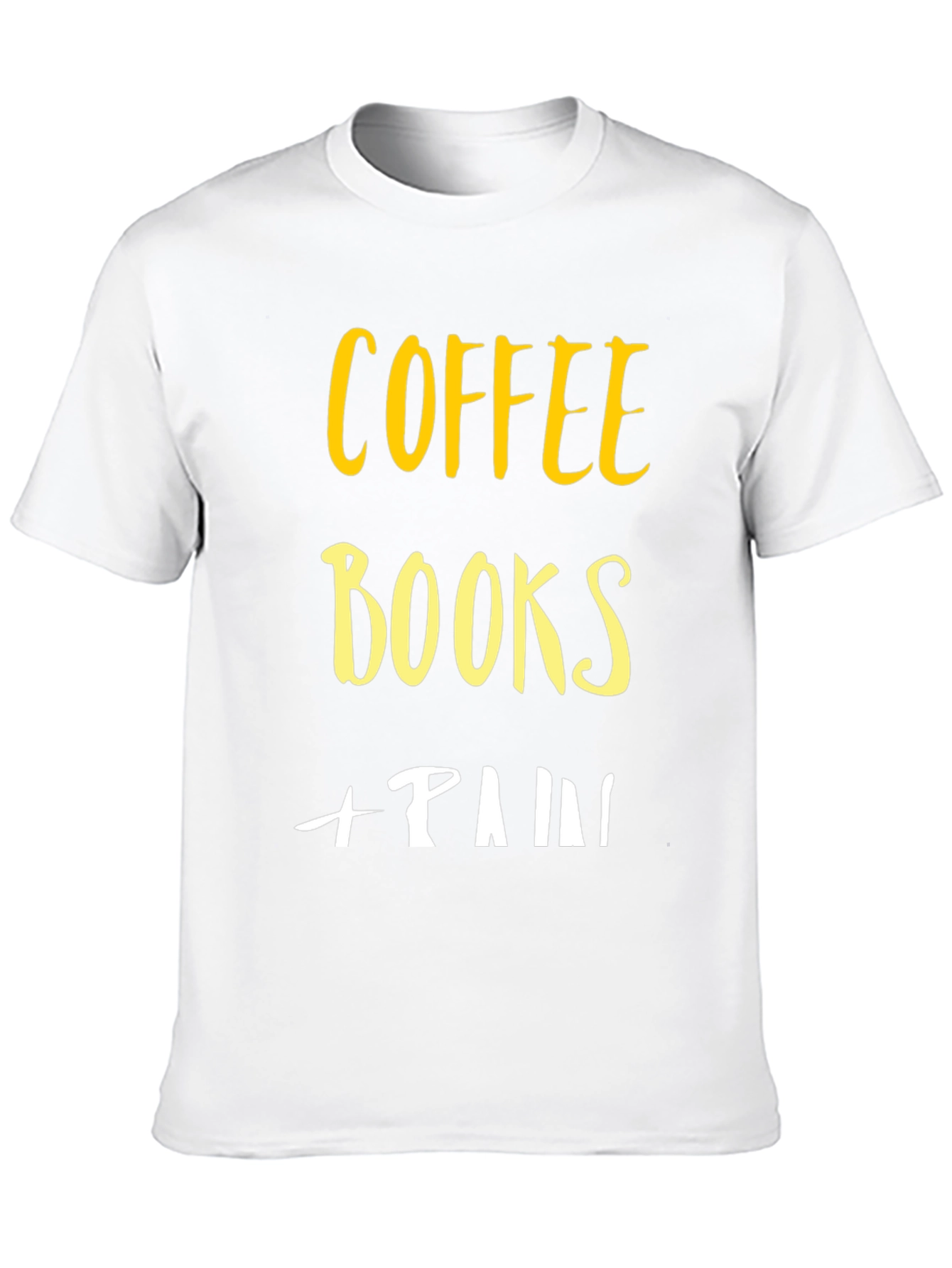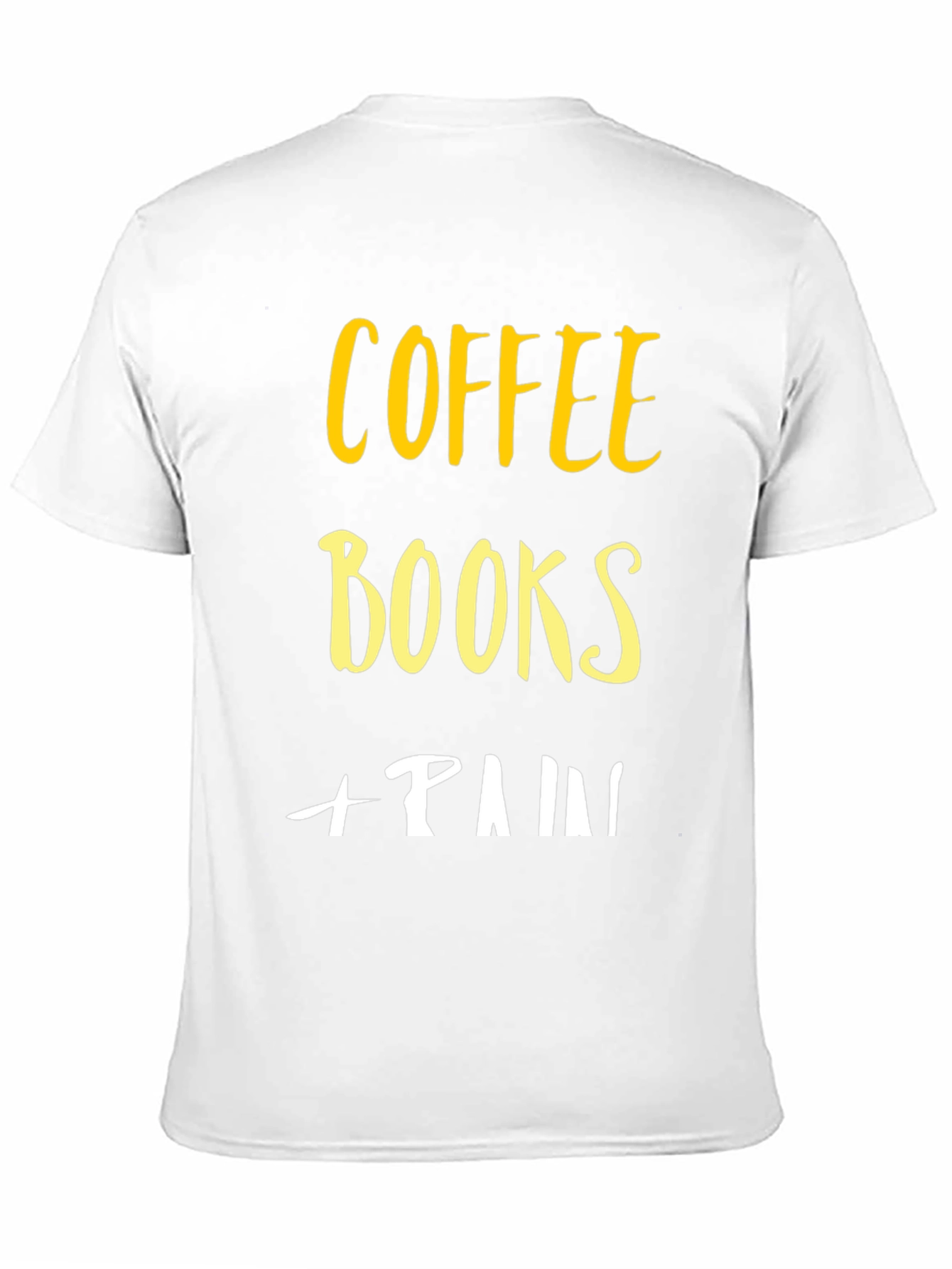 This classic black t-shirt features a bold graphic design. The phrase 'Coffee Books + Pain' is printed vertically in a stylish font. The word 'Coffee' is in bright yellow, 'Books' in a softer yellow and '+ Pain' is in white. Made from a soft-looking fabric, this tee appears comfortable and durable. The relaxed fit makes it suitable for everyday wear. Ideal for book lovers, coffee enthusiasts, or anyone with a witty sense of humor. This shirt makes a statement while keeping you comfortable.