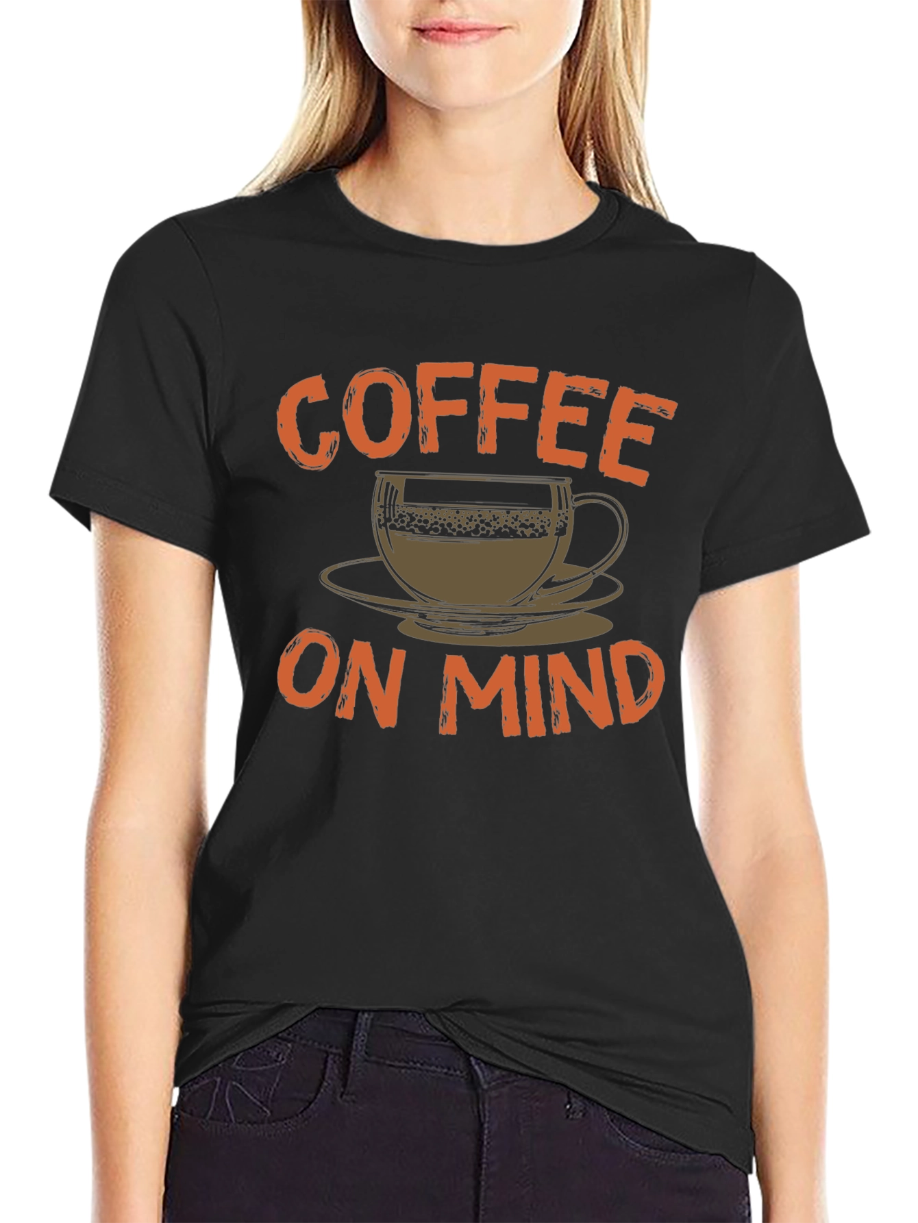 Show off your love for coffee with this stylish black t-shirt. Featuring a classic crew neck and short sleeves, this tee is made from a comfortable cotton blend, perfect for everyday wear. The eye-catching graphic print showcases a coffee cup with the phrase "Coffee On Mind" in bold orange lettering. This versatile t-shirt is ideal for casual outings, coffee dates, or lounging at home. Pair it with jeans or shorts for a relaxed and trendy look. A must-have for any coffee enthusiast's wardrobe!