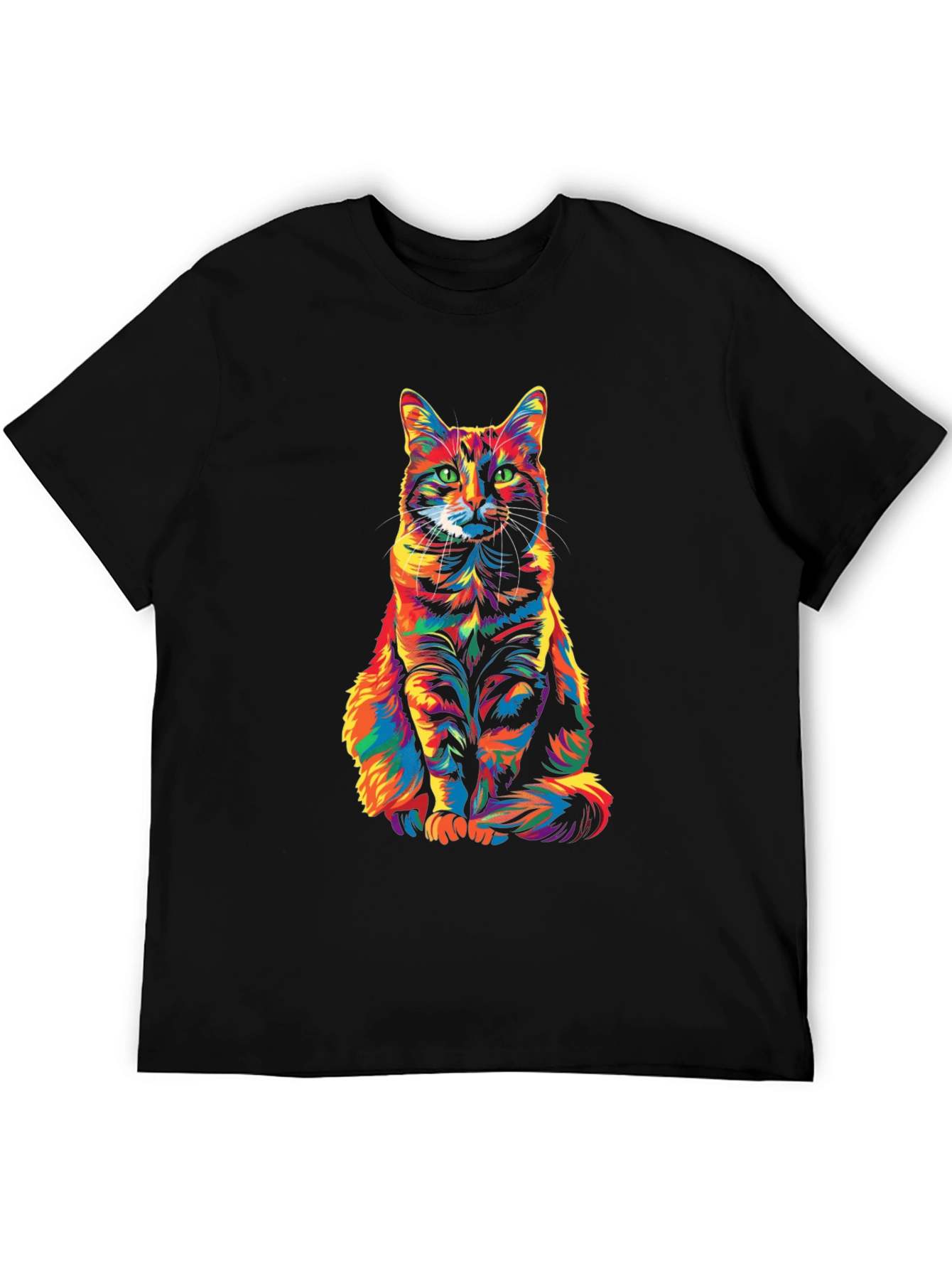 Show your love for cats with this eye-catching black T-shirt. The vibrant, colorful cat print is sure to turn heads and make a statement. Made from comfortable, breathable fabric, this tee is perfect for everyday wear. The detailed artwork features a seated cat with striking colors, making it a unique and fashionable piece. Wear it casually with jeans or dress it up with a blazer. This cat print T-shirt is a must-have for any cat lover's wardrobe and a great conversation starter. It’s also a unique gift idea for friends and family.