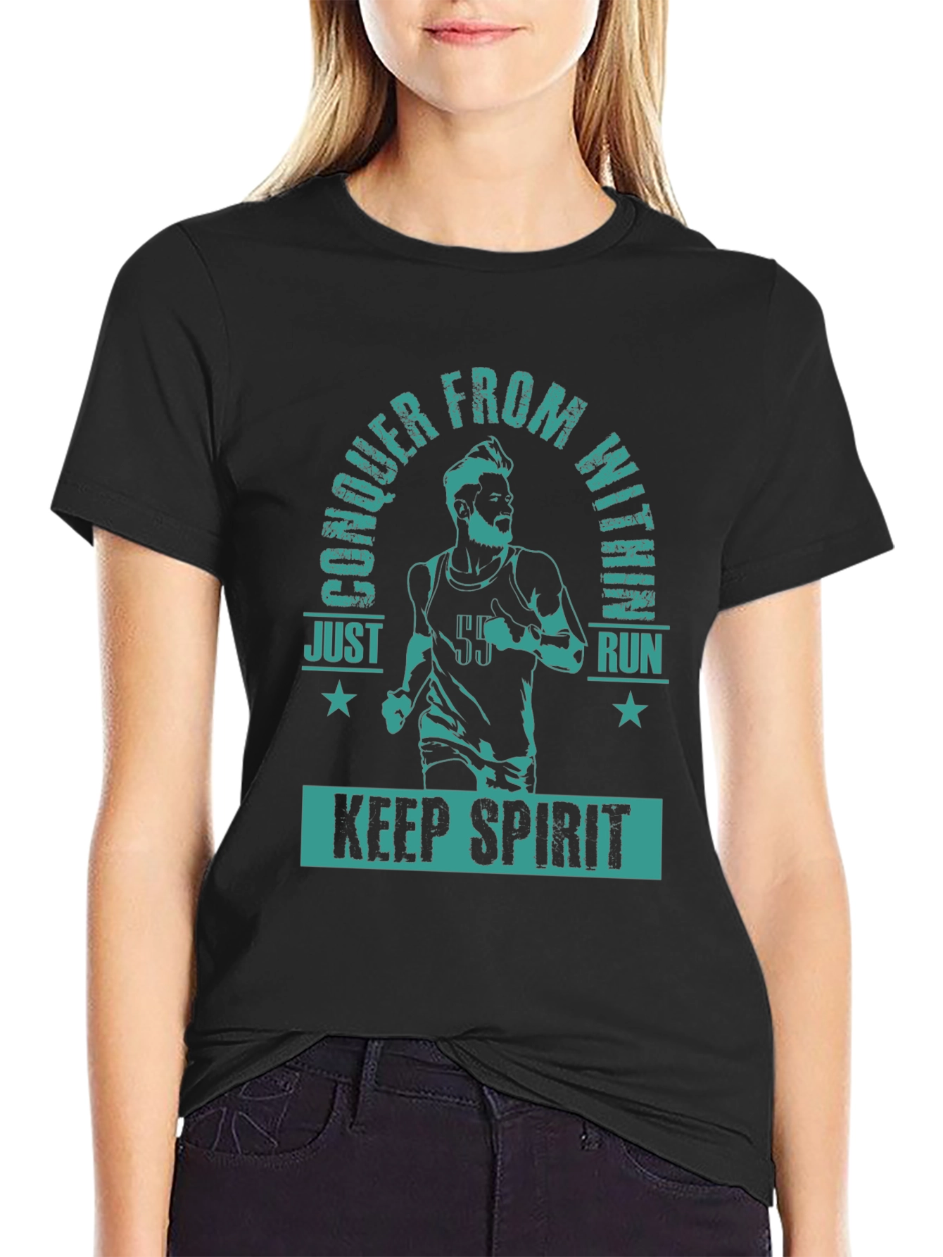 This stylish black t-shirt features a motivational design ideal for runners and fitness enthusiasts. The graphic includes a silhouette of a determined runner, encircled by the phrase "CONQUER FROM WITHIN," with additional text that reads "JUST RUN" and "KEEP SPIRIT." The design is rendered in an attractive teal color, creating a striking contrast against the black fabric. This tee is perfect for workouts, casual wear, or making a statement about your dedication to running and personal growth. Show your passion with this unique and comfortable shirt!