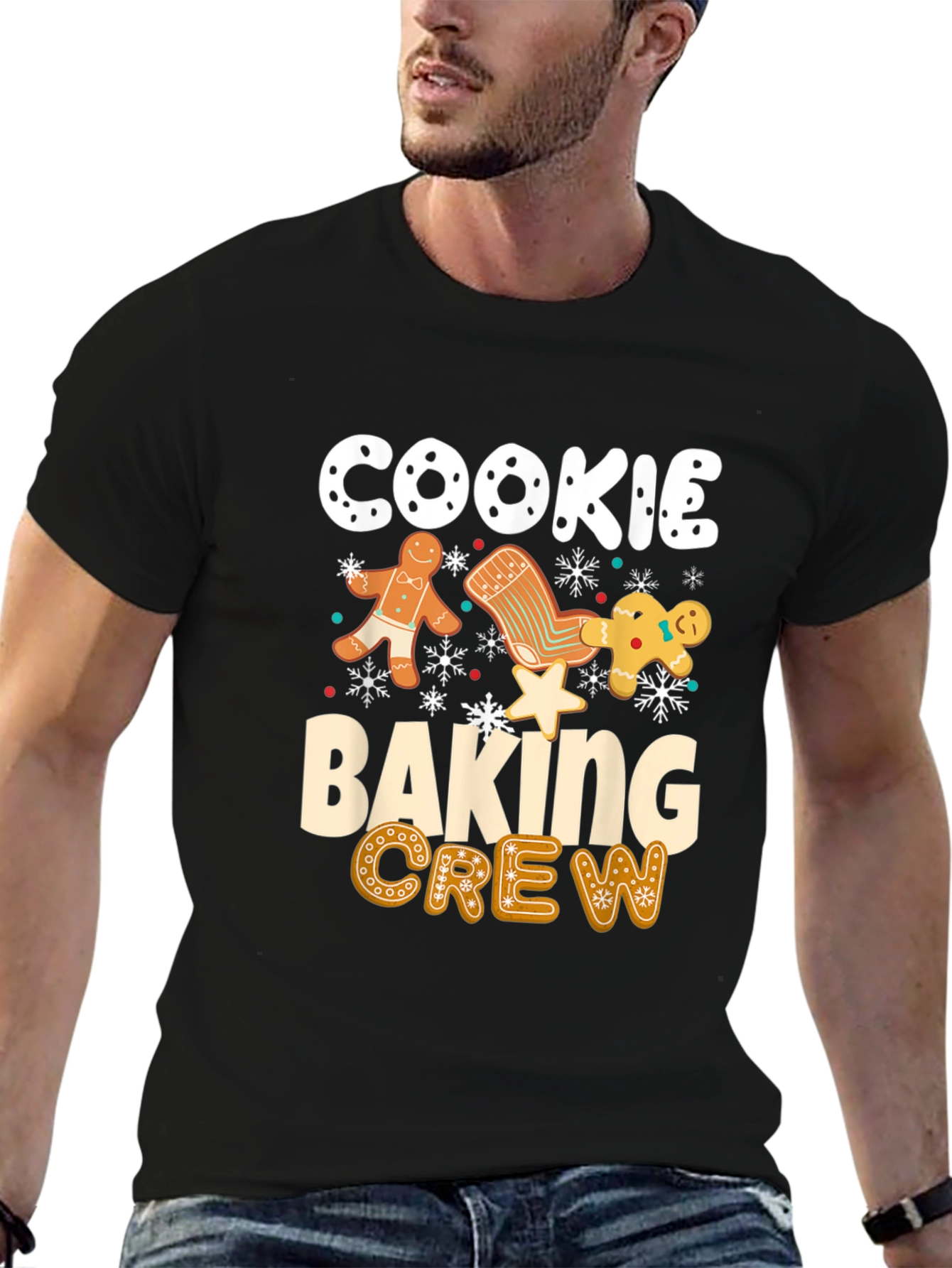 Get ready for the holiday season with this fun and festive Cookie Baking Crew T-shirt. This tee features "COOKIE" in a dotted font, "BAKING" in a plain font, and "CREW" in a gingerbread-style font, complete with whimsical gingerbread cookie graphics. Perfect for family baking days or Christmas parties, this soft, comfortable T-shirt will spread holiday cheer wherever you go. Makes a great gift for the baker in your life! Available in a classic black color.