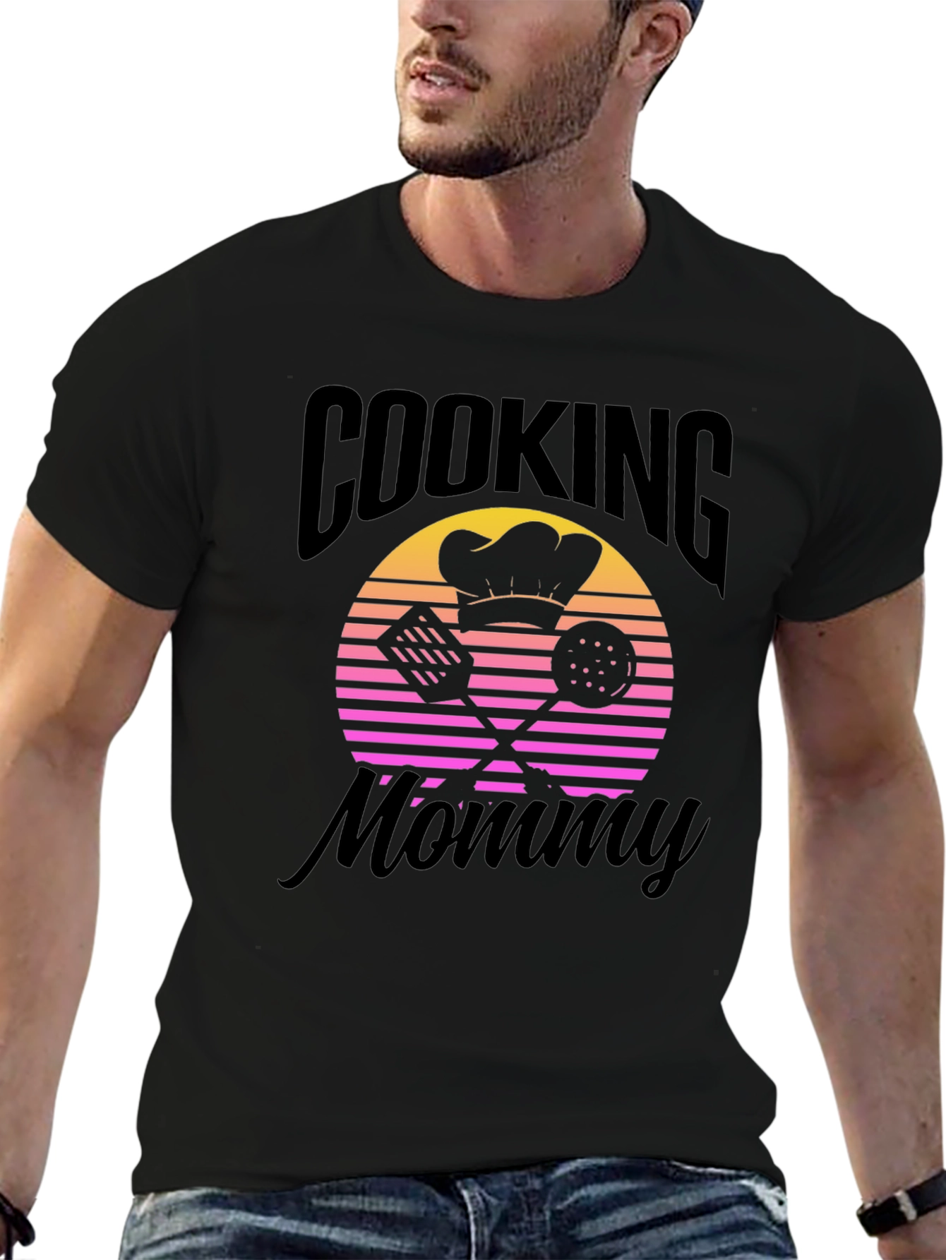 This stylish black t-shirt features a fun and playful design for cooking enthusiasts. The graphic includes "COOKING" written above a retro sunset-style circle with pink and yellow hues, and "Mommy" at the bottom. The graphic showcases a chef's hat, spatula, and slotted spoon in silhouette, making it perfect for moms who love to cook. This comfortable tee is ideal for casual wear, cooking sessions, or as a gift for a special mom. Show off your love for cooking with this unique and eye-catching tee!