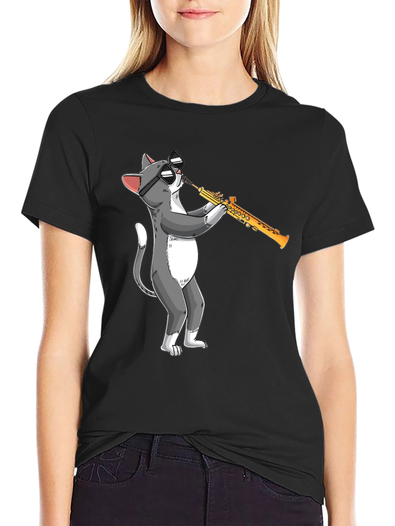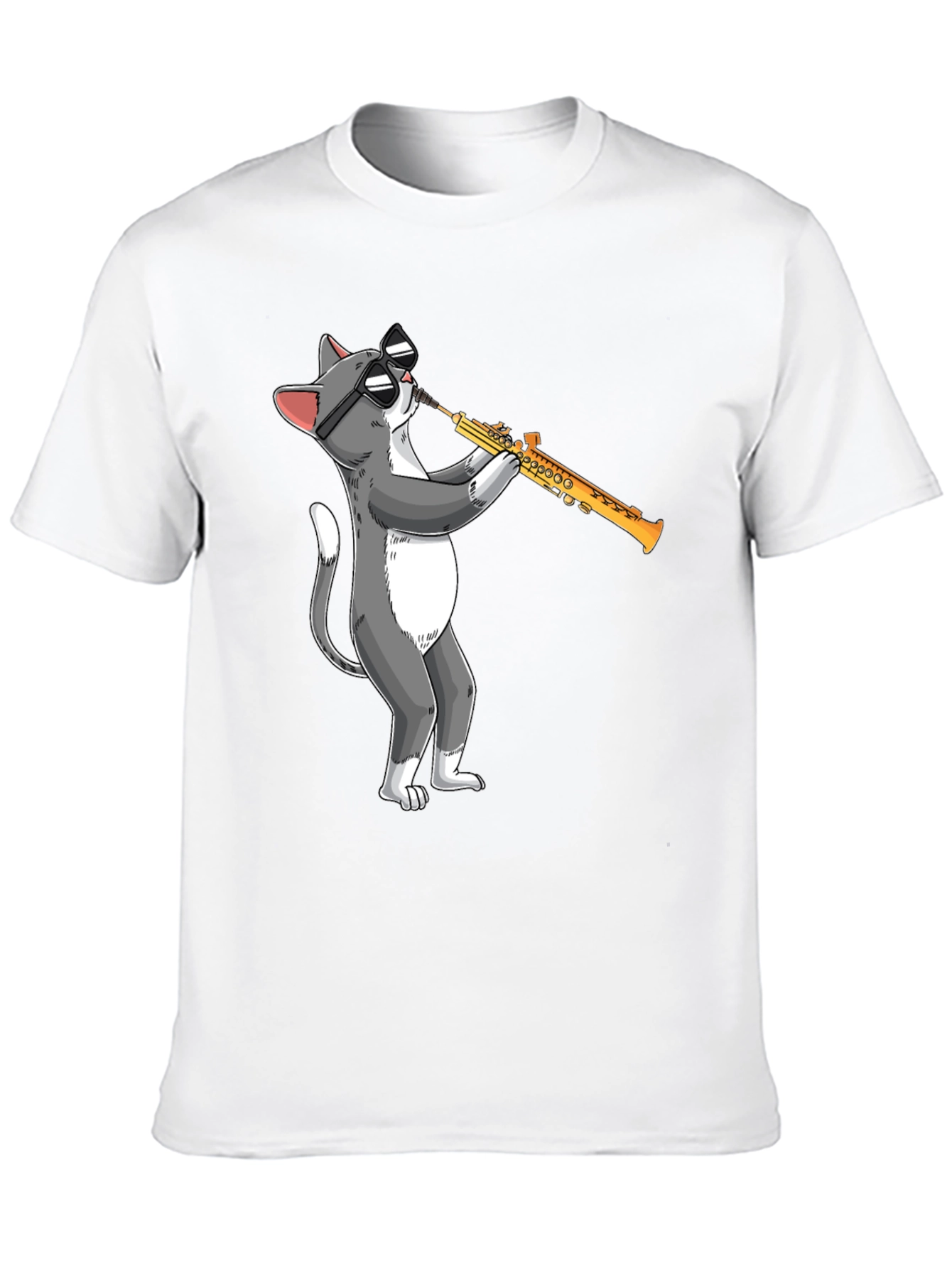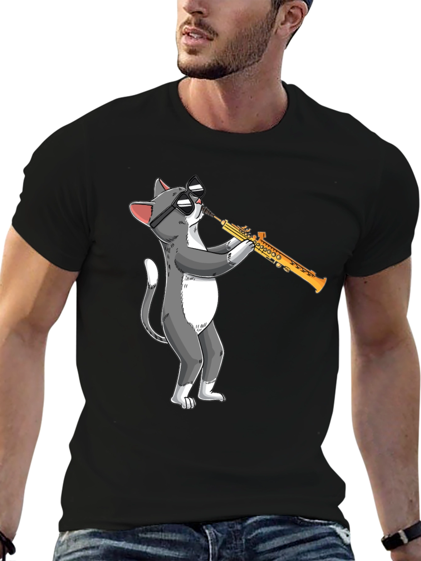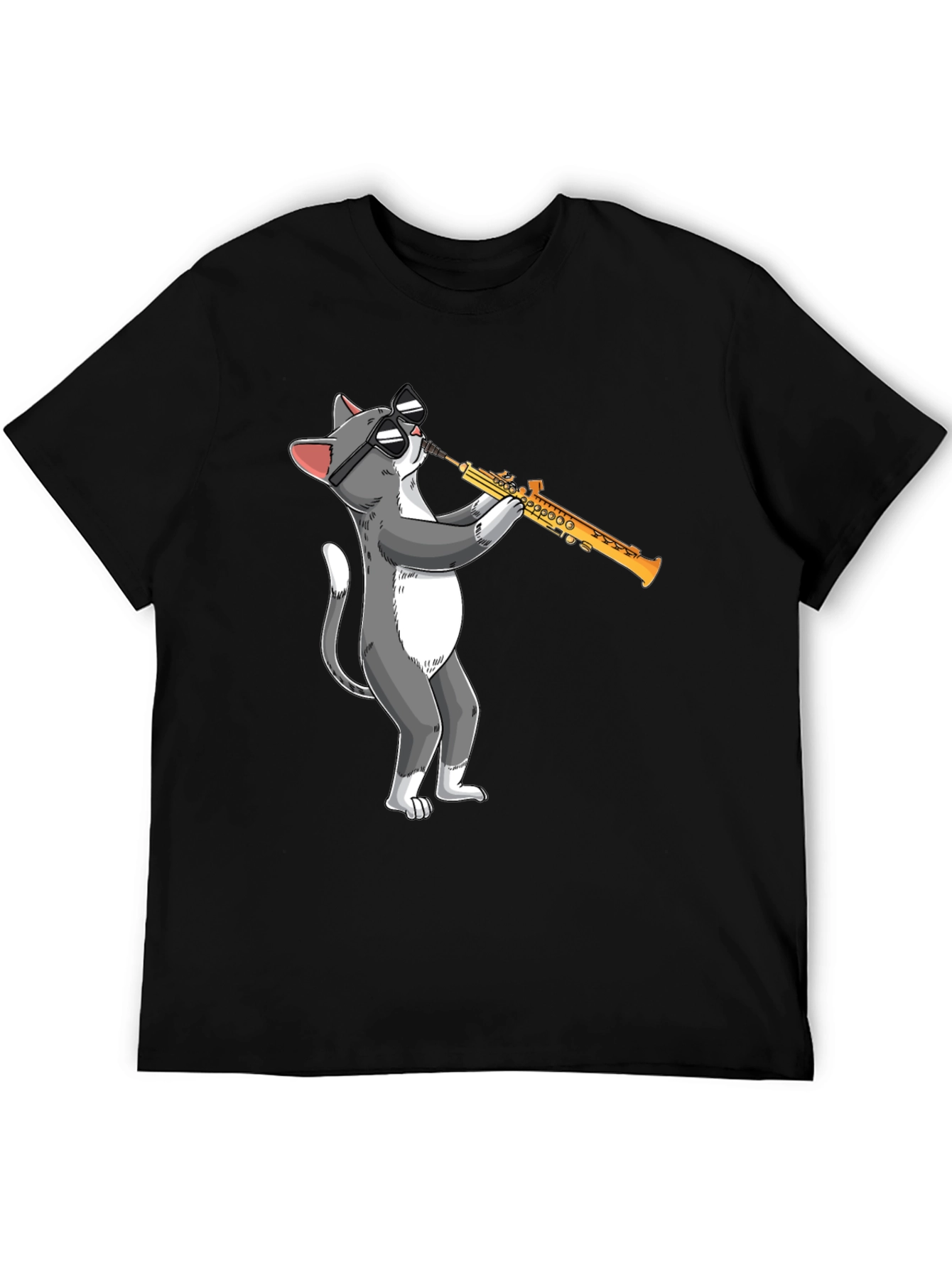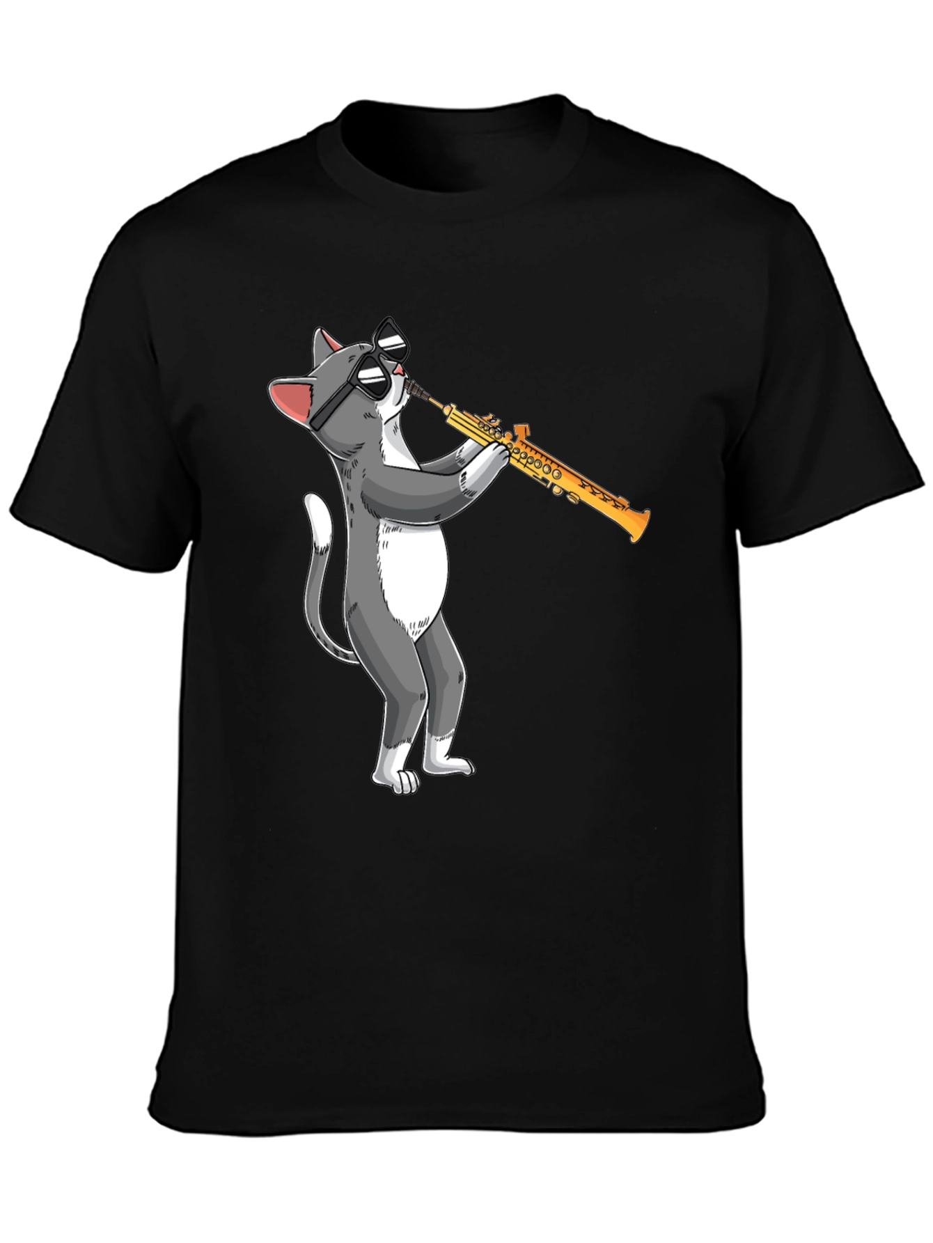 This black t-shirt features a fun and quirky graphic of a cool cat playing the saxophone. The design showcases a gray and white cat wearing sunglasses, adding a touch of humor and musical flair to your wardrobe. Made from a soft, comfortable fabric, this tee is perfect for casual wear and everyday style. Ideal for music lovers, cat enthusiasts, or anyone who enjoys unique and eye-catching apparel. Wear it to concerts, casual outings, or just lounging at home. This playful graphic tee is sure to be a conversation starter and a fun addition to your clothing collection.
