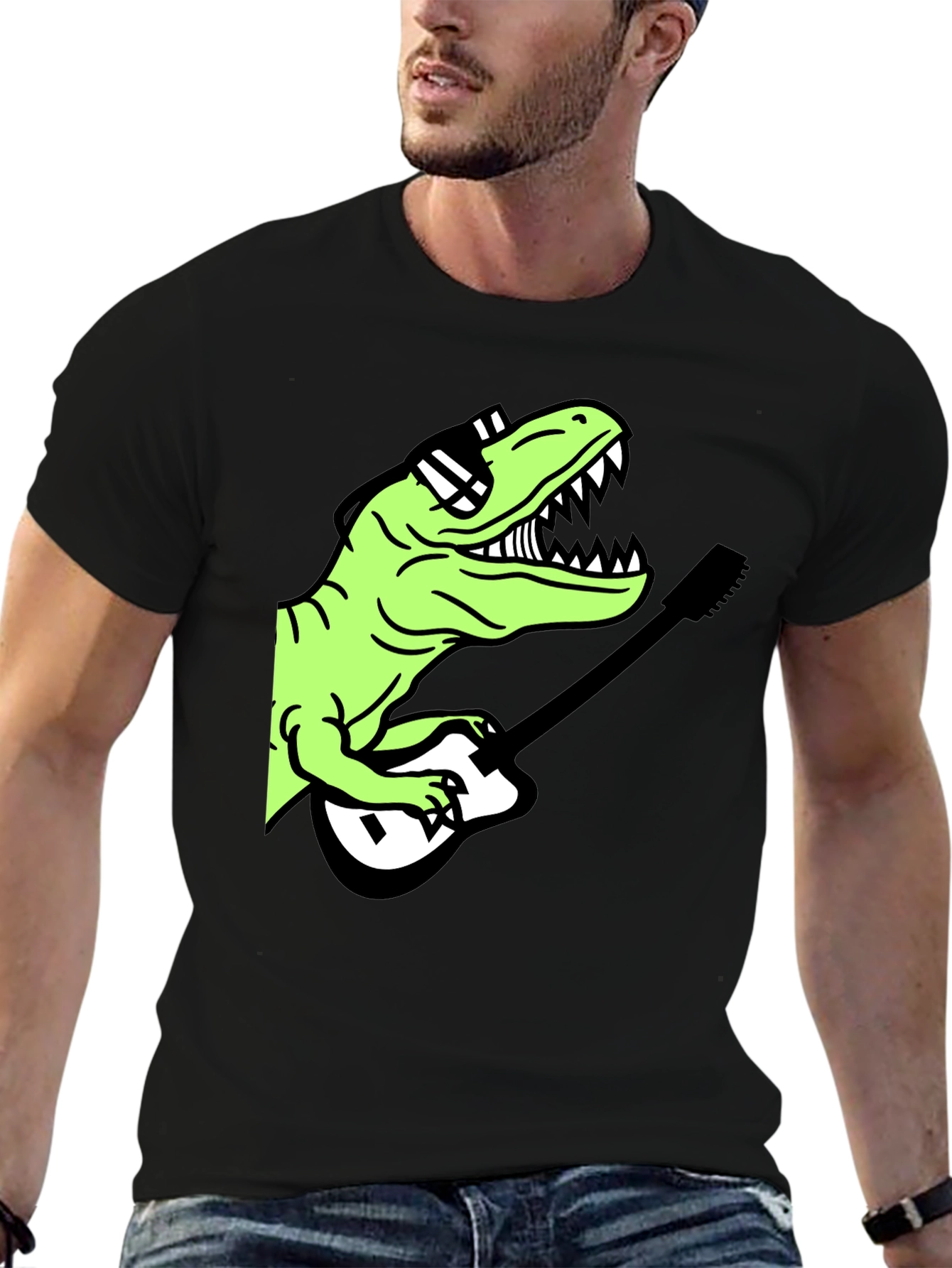 Rock out with this eye-catching black t-shirt! Featuring a vibrant green cartoon dinosaur shredding on a guitar, this tee adds a fun and edgy twist to your wardrobe. The dinosaur, sporting cool sunglasses, gives off a playful yet rebellious vibe. Made from a comfortable fabric, it's perfect for casual wear, concerts, or expressing your unique style. Stand out from the crowd with this unique conversation-starter. The unisex design and classic fit make it an awesome gift for music lovers and dino enthusiasts alike. Get yours now and let the good times roll!