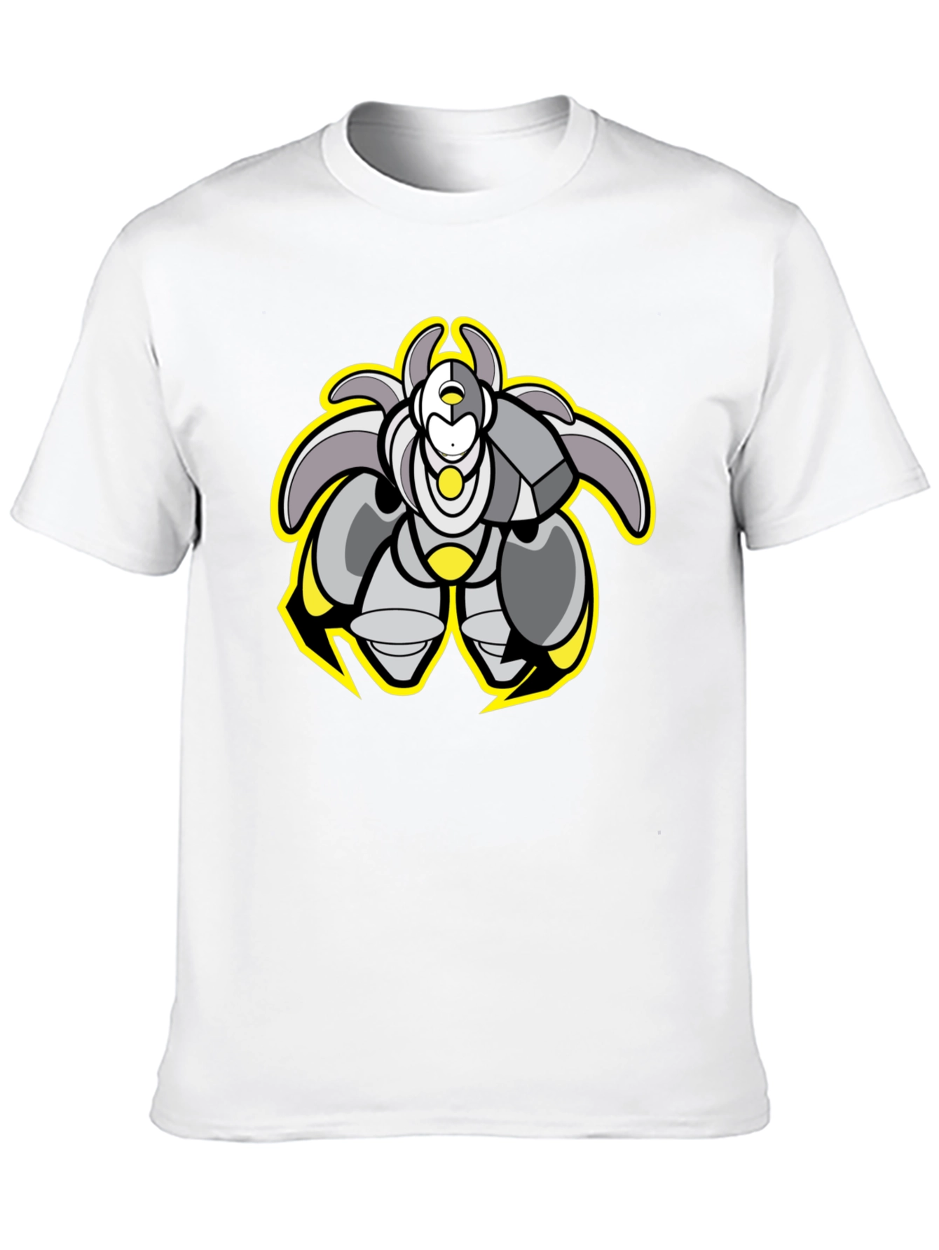 This black t-shirt features a cool and unique robot graphic. The robot is depicted in shades of gray and white, with a vibrant yellow outline that makes the design pop. The cartoon style gives the robot a fun and playful vibe. Made from comfortable and durable fabric, this tee is perfect for casual wear. Whether you're heading out with friends, or just hanging out at home, this shirt is sure to turn heads and spark conversations. Show off your love for robots with this unique piece.