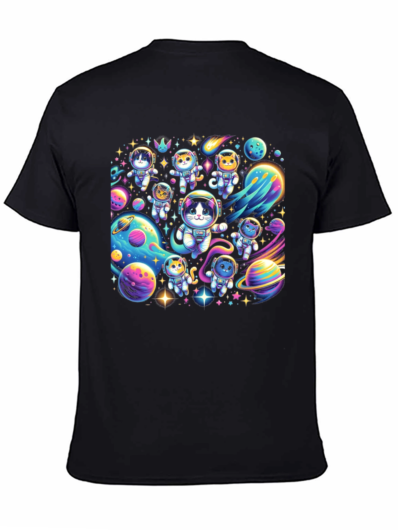 Explore the universe in style with this fun black t-shirt featuring an array of adorable cartoon cats dressed as astronauts amidst a vibrant space scene. Planets, stars, and comets surround the feline cosmonauts, creating a whimsical and eye-catching design. Made from a comfortable and breathable fabric, this tee is perfect for everyday wear, casual outings, or as a unique gift for cat lovers and space enthusiasts alike. Stand out from the crowd and showcase your playful personality with this one-of-a-kind space cat t-shirt!