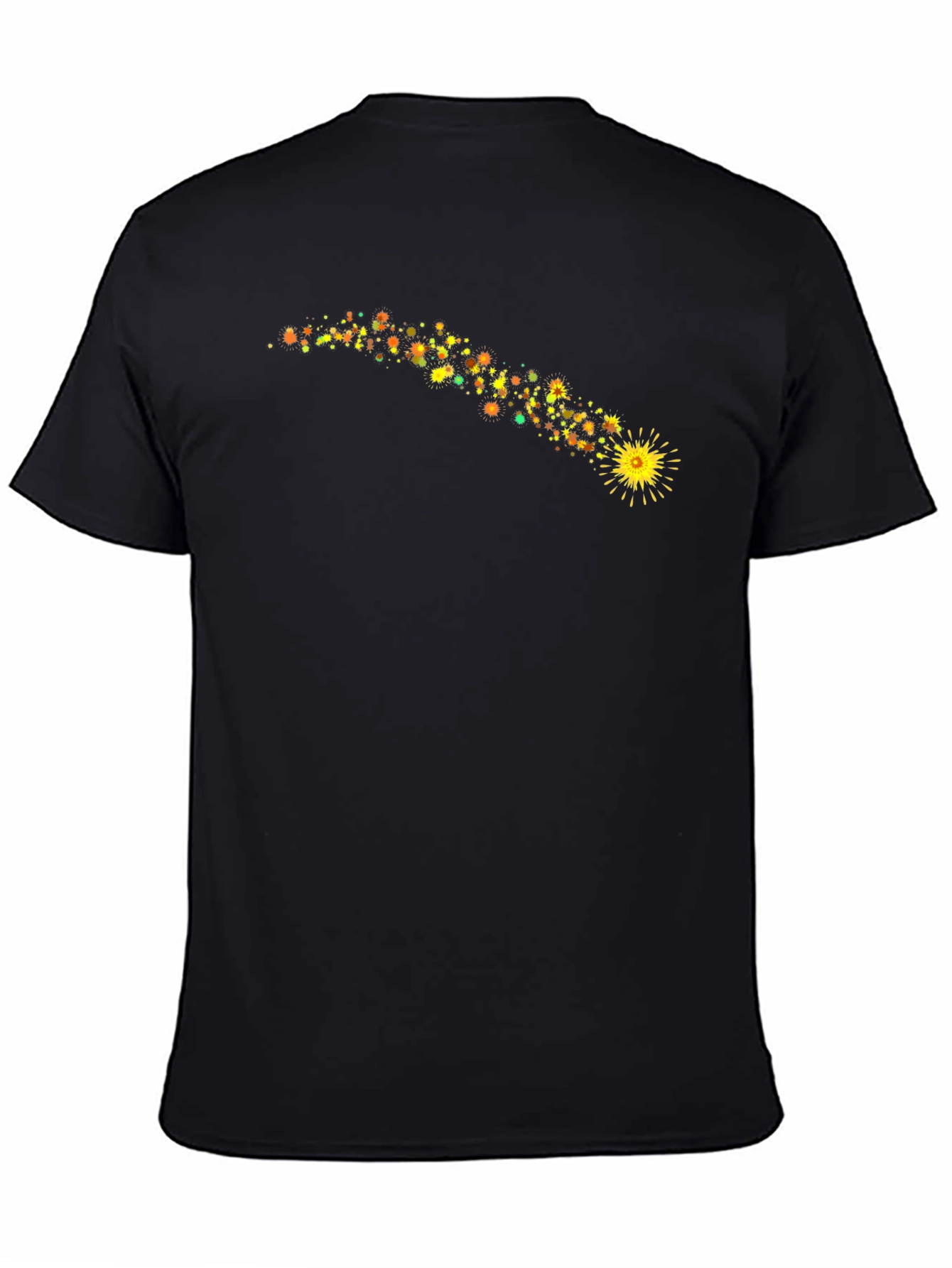 This classic black t-shirt features a vibrant and eye-catching design. A colorful comet streaks across the chest, composed of bright yellow, orange, and green splatters trailing behind a shining starburst. Made from a soft-looking fabric, this shirt offers both style and comfort. Its versatile design makes it perfect for casual wear, concerts, or adding a touch of cosmic flair to your everyday look. Show off your unique style with this stellar t-shirt.