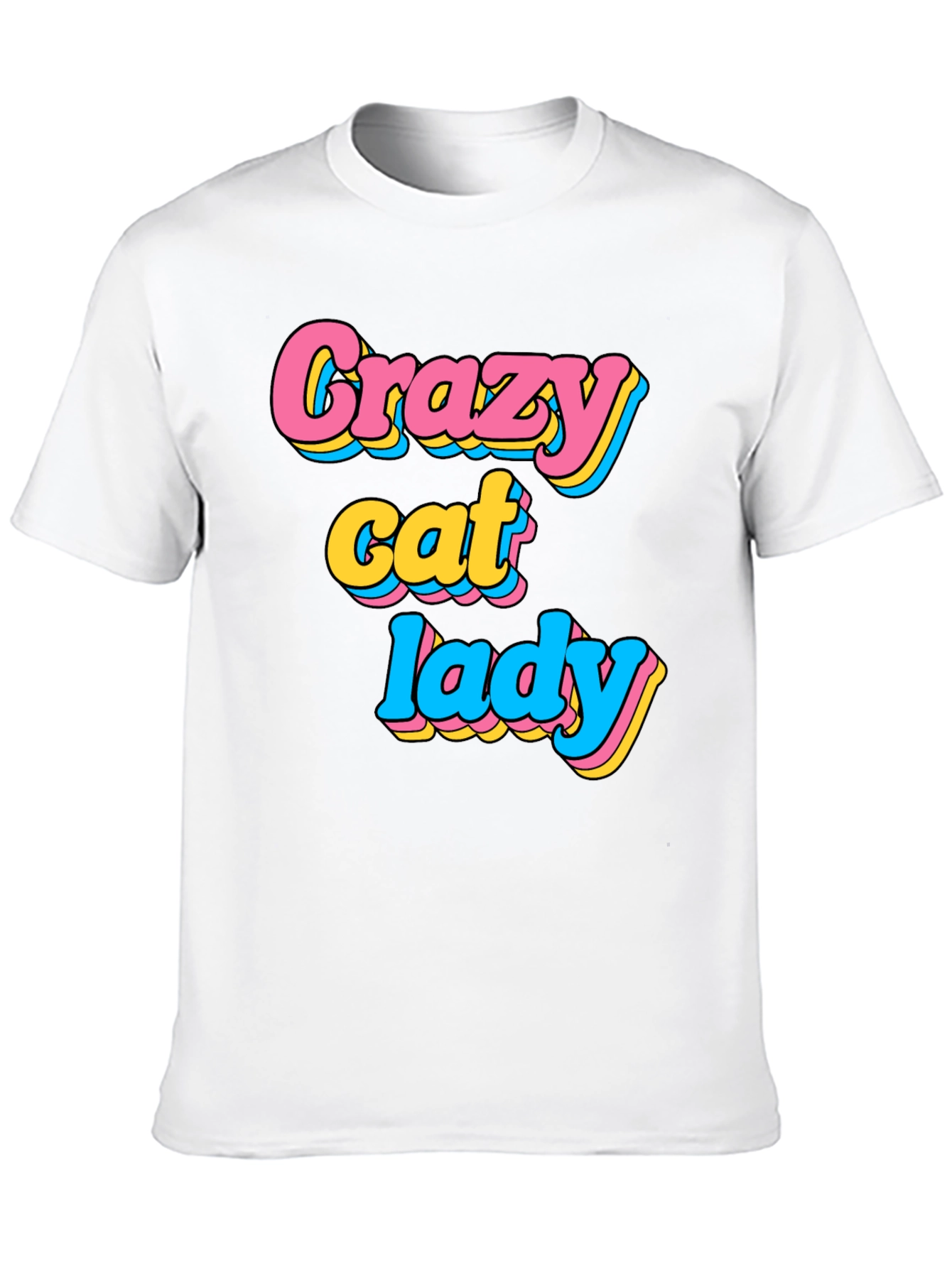 Show off your love for cats with this fun and stylish black t-shirt! Featuring the words 'Crazy Cat Lady' in a playful, layered retro font with pink, yellow, and blue outlines, this tee is sure to turn heads. Made from a comfortable, breathable fabric, this classic fit shirt is perfect for casual wear, lounging at home, or visiting your favorite feline friends. It's an ideal gift for any cat lover or a fun addition to your own wardrobe. Get yours today and let the world know you're proud to be a crazy cat lady!