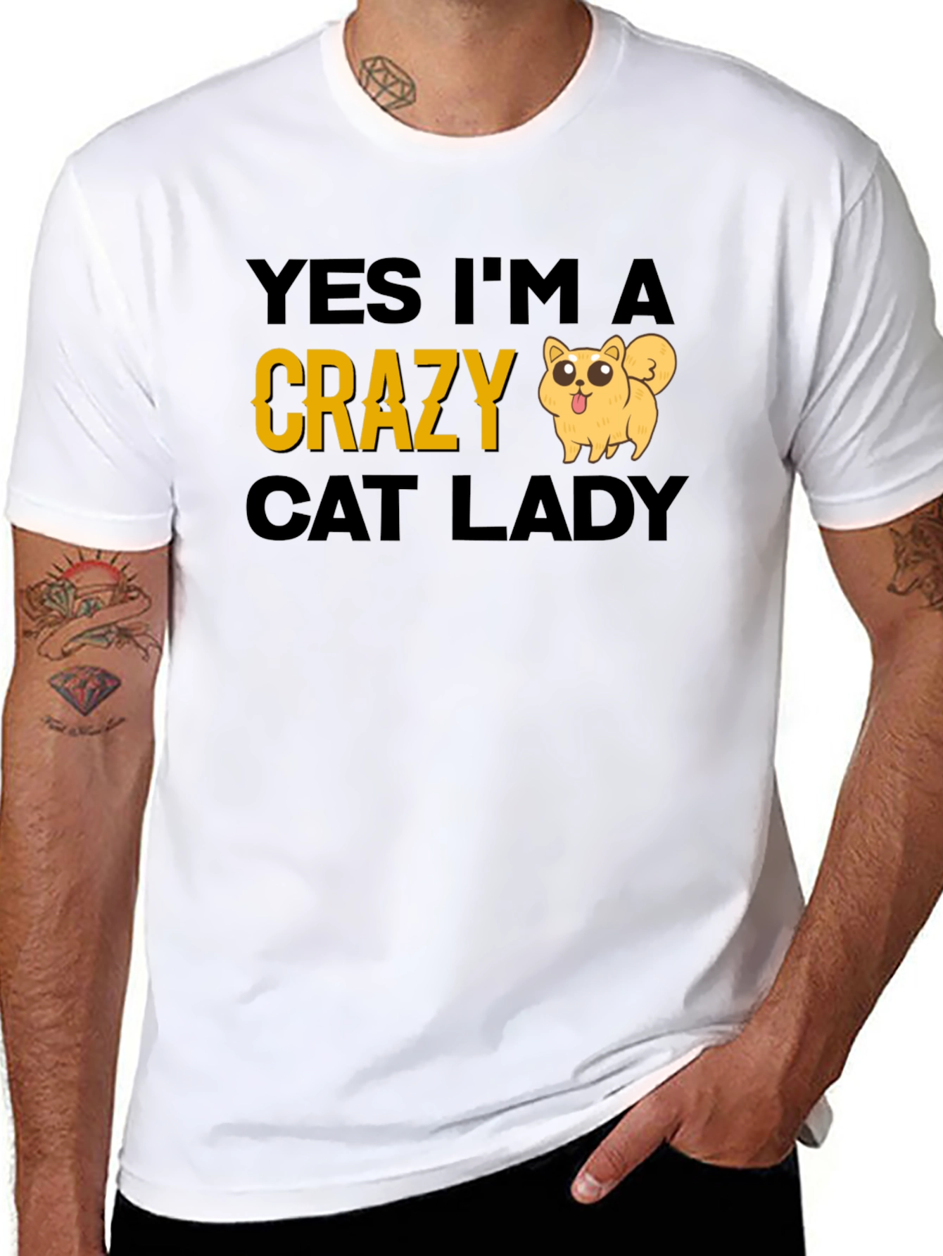 Show off your love for cats with this hilarious "Yes I'm a Crazy Cat Lady" t-shirt! This black tee features a playful design with the word "Crazy" in a bold, eye-catching yellow font, and a cute cartoon cat. Made from a soft, comfortable fabric, this shirt is perfect for casual wear, cat-themed events, or as a fun gift for the feline fanatic in your life. Pair it with jeans, leggings, or a skirt for a purr-fectly stylish outfit. This statement tee is a great conversation starter and a fun way to express your personality. Available in various sizes.