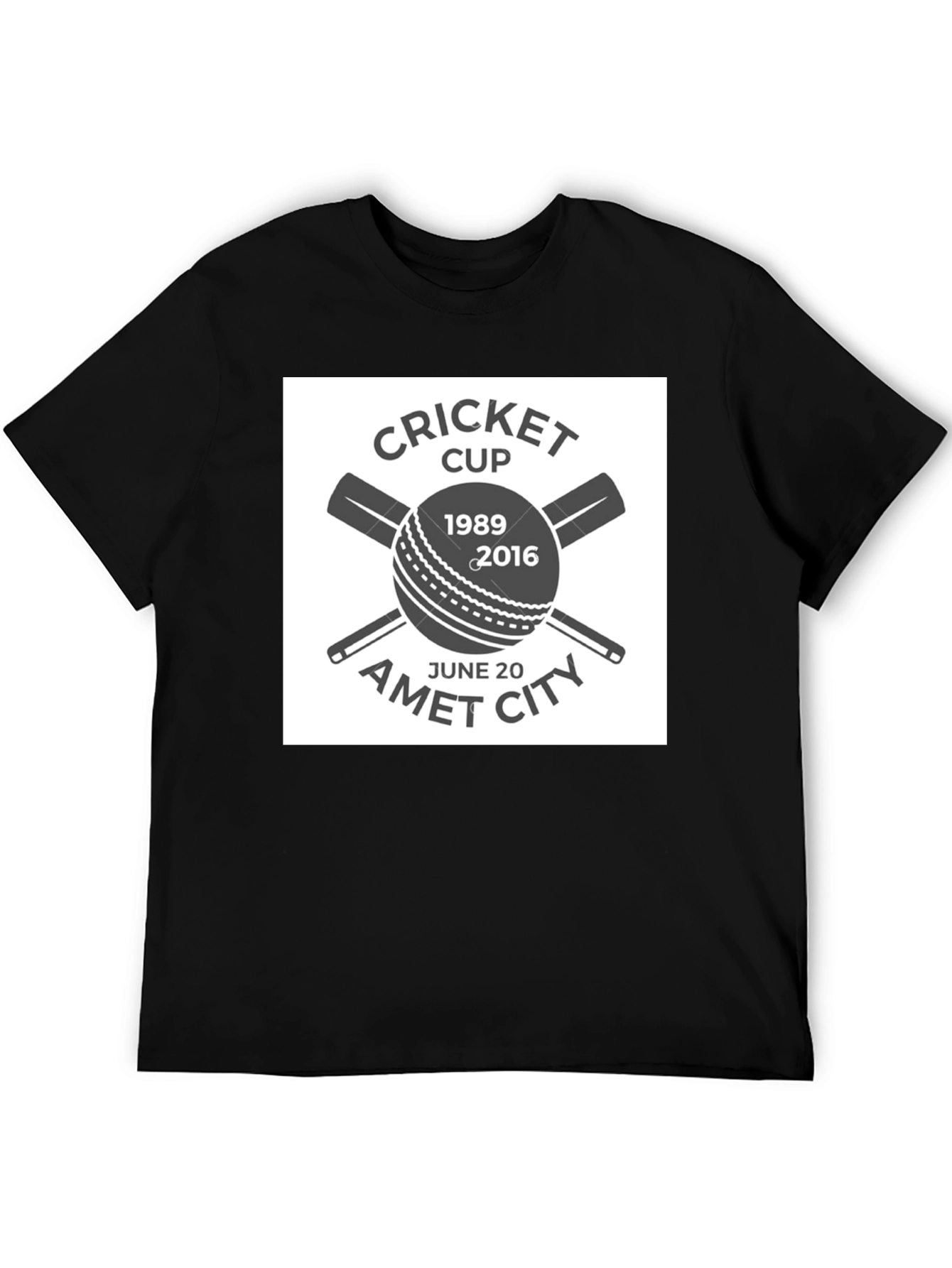 Showcase your love for cricket with this classic black t-shirt. Featuring a bold graphic print with 'Cricket Cup', '1989-2016', and 'June 20 AMET CITY', it's a perfect conversation starter. The design includes crossed cricket bats and a detailed ball, creating a sporty yet stylish look. Made from comfortable, breathable fabric, this tee is ideal for casual wear, sports events, or simply hanging out with friends. A great addition to any cricket enthusiast's wardrobe!