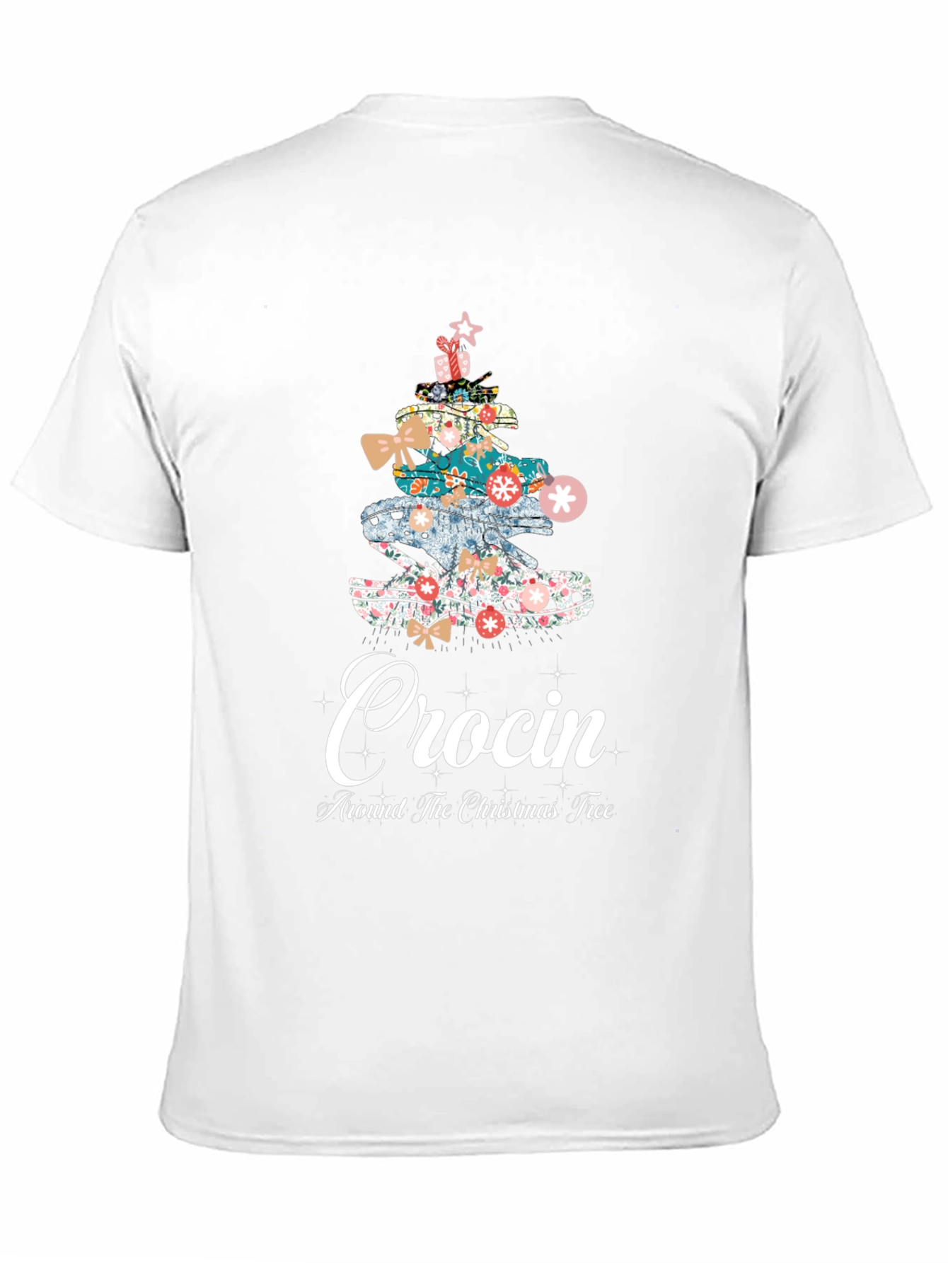 Celebrate the holidays with this unique and festive black t-shirt. The design features a playful Christmas tree made up of stacked Croc-like shoes, decorated with ornaments, bows, and topped with a star and gifts. The phrase "Crocin' Around The Christmas Tree" is playfully printed below, adding a touch of humor to the holiday season. This shirt is perfect for casual gatherings, Christmas parties, or simply spreading holiday cheer. It's a fun and comfortable way to show off your love for Crocs and the festive spirit of Christmas. A great conversation starter and a quirky addition to your holiday wardrobe!