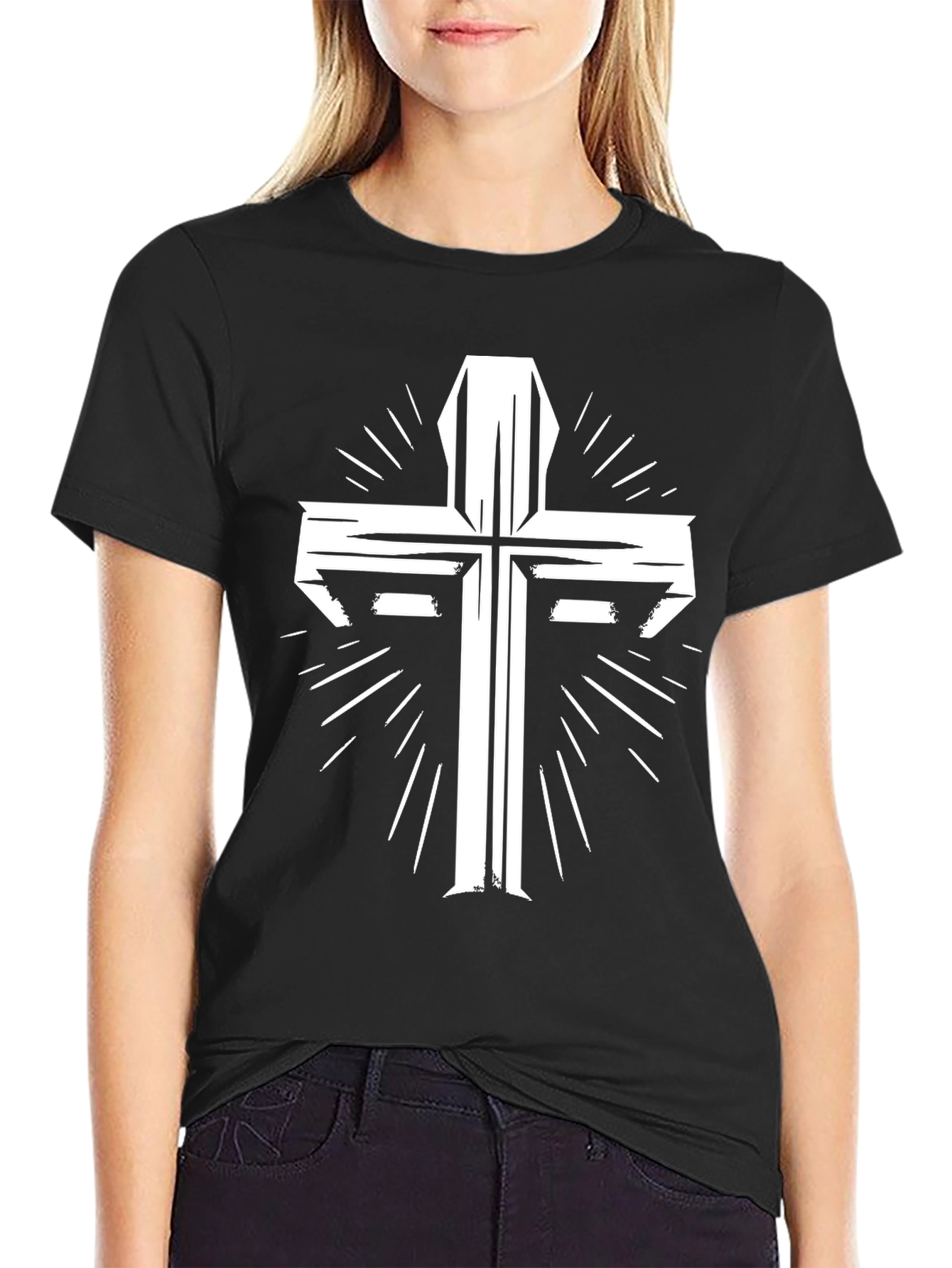 Show your faith with this striking black T-shirt featuring a bold, white cross graphic. The cross design is stylized with radiating lines, adding a unique and modern touch to a classic symbol. Made from a comfortable, breathable fabric, this tee is perfect for everyday wear, church gatherings, or casual outings. The durable print ensures the design remains vibrant wash after wash. This tee is more than just clothing; it's a statement of belief. Perfect for gifting to friends and family who share your faith. Grab yours today and wear your faith with pride!