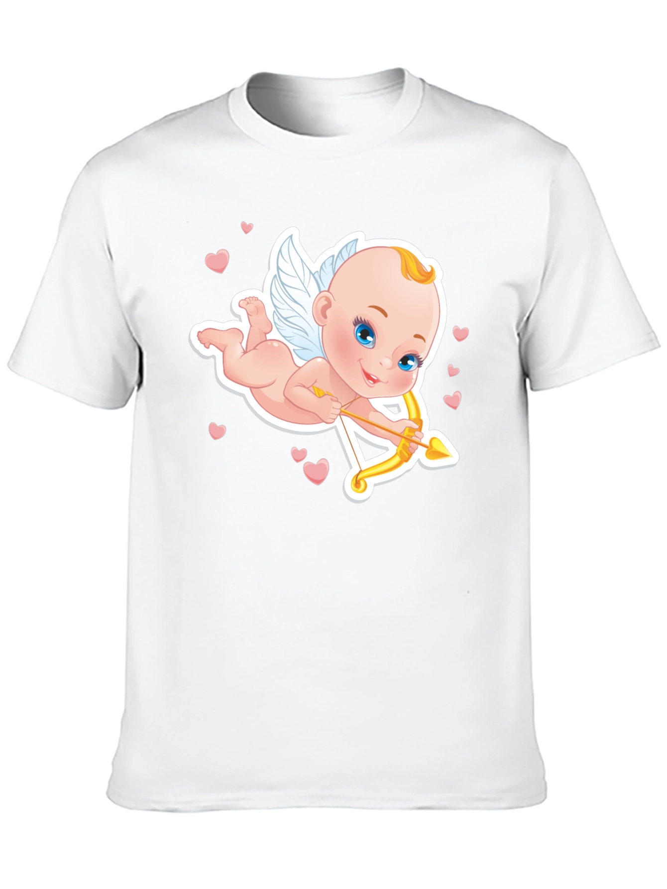 Spread the love with this adorable Cupid graphic tee! This black t-shirt features a charming cartoon Cupid design, complete with wings, a bow and arrow, and surrounded by hearts. The vibrant print stands out against the classic black background, making it a fun and playful addition to any wardrobe. Made from comfortable materials, this tee is perfect for casual wear, Valentine's Day celebrations, or simply showing off your love for all things cute. Pair it with jeans, shorts, or a skirt for a versatile and stylish look.