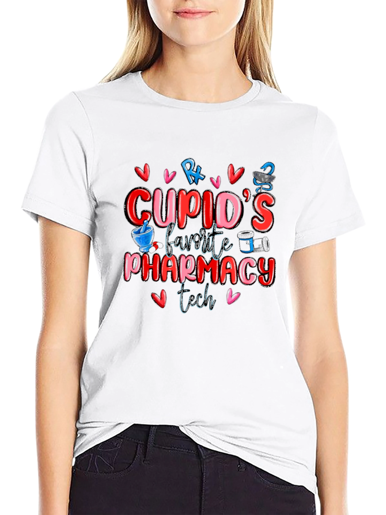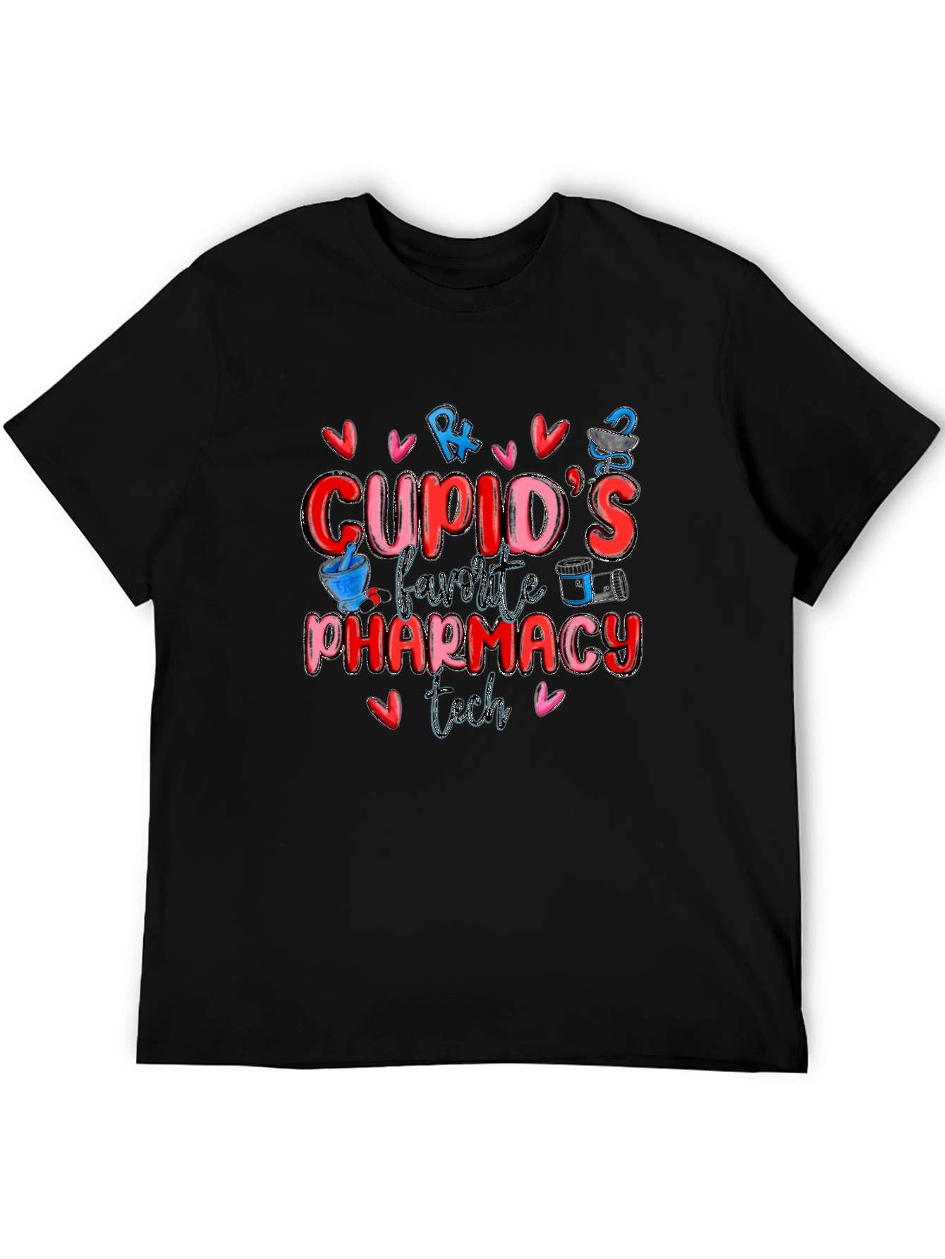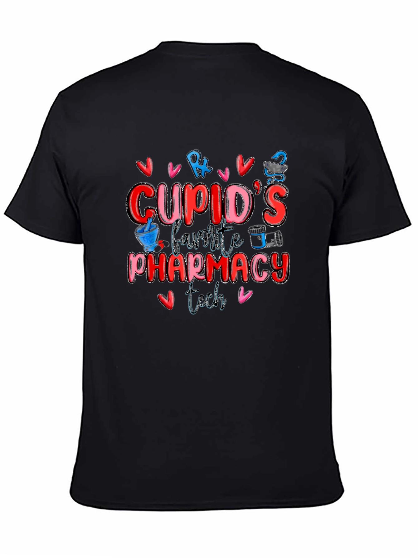 Show your love for pharmacy work with this stylish black t-shirt. Featuring a vibrant and playful design, this shirt proudly proclaims "Cupid's Favorite Pharmacy Tech" surrounded by cute hearts, pharmacy symbols and images. Made from a comfortable material, this shirt is perfect for everyday wear at work or casual outings. The colorful graphic design is sure to catch attention and spark conversations. It’s a fun way to express your passion for your profession and celebrate Valentine's Day or any day of the year. Grab this tee for yourself, or gift it to your favorite pharmacy technician!