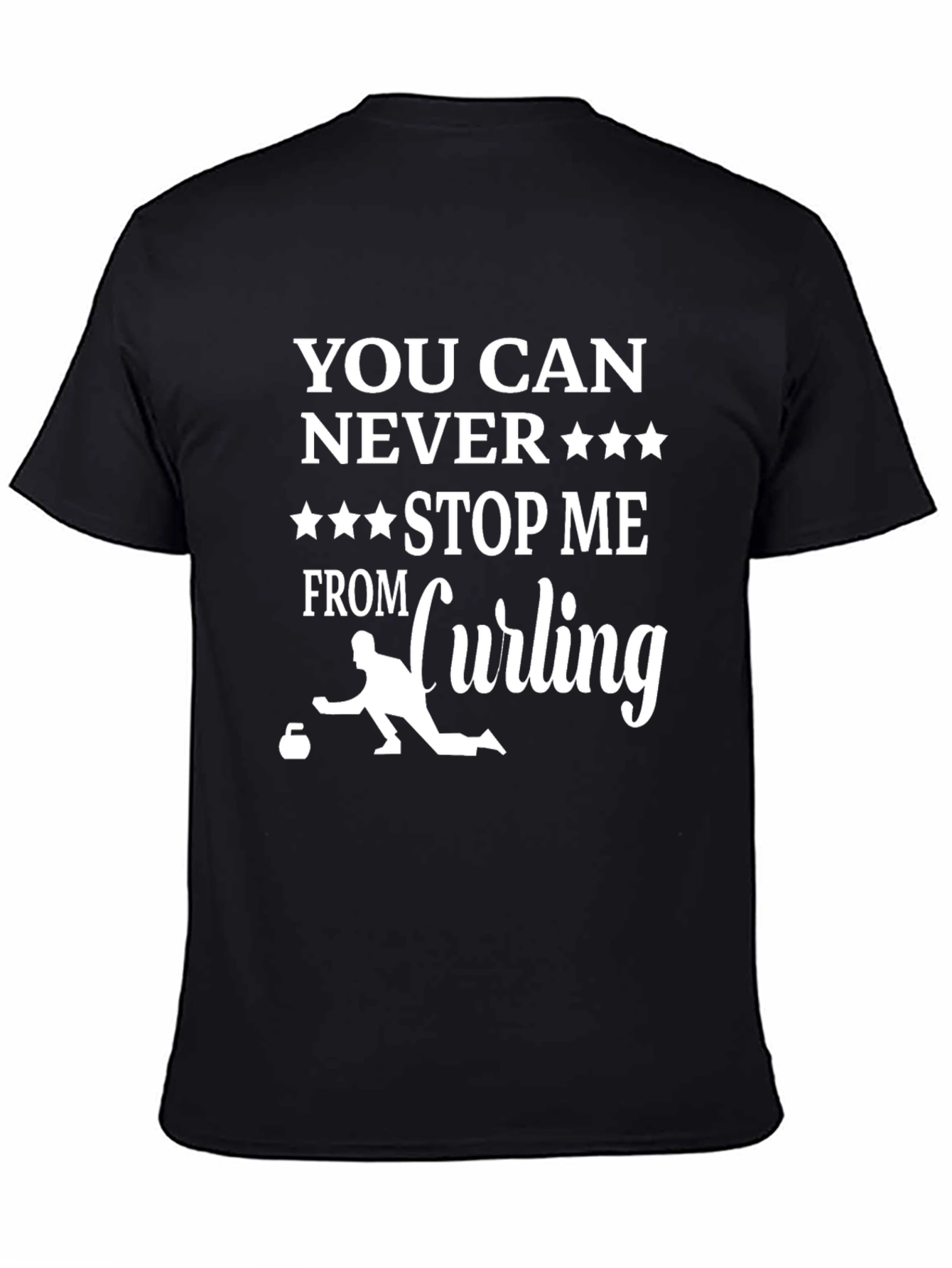 Show your passion for curling with this unique graphic t-shirt. The design features bold white lettering that reads, "You Can Never Stop Me From Curling," accompanied by a stylized image of a curler in action. Made from what appears to be a soft, breathable black fabric, this tee offers both comfort and style. Perfect for curling enthusiasts, players, or anyone who loves this exciting sport. Wear it to your next curling match, casual outings, or simply as a statement piece to showcase your love for curling. This t-shirt is sure to be a conversation starter and a fun addition to any wardrobe.
