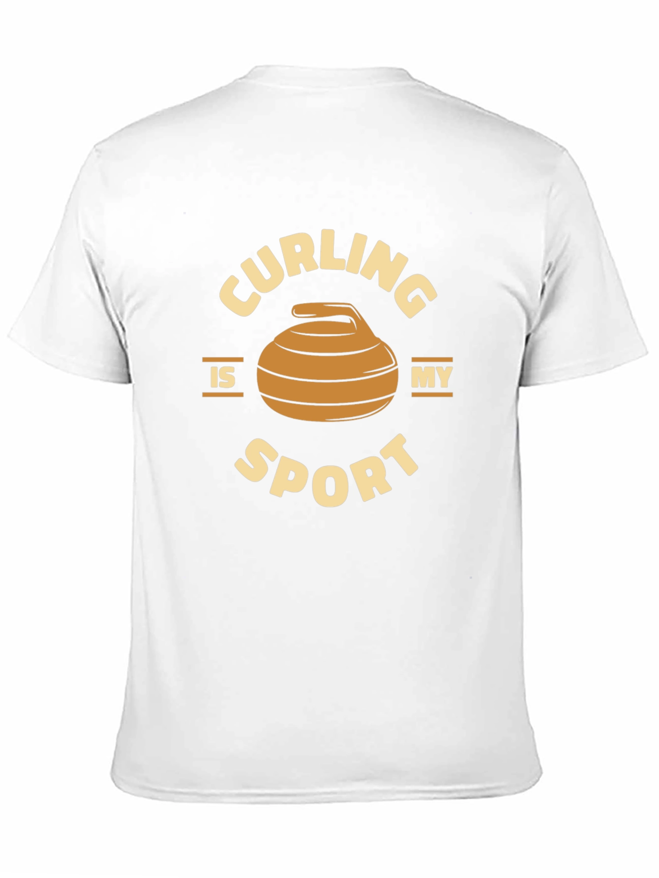Show off your love for the sport of curling with this stylish black t-shirt. The design features a classic curling stone graphic prominently displayed on the front, encircled by the text "Curling is My Sport" in a bold, vintage-inspired font. Made from what appears to be a comfortable and breathable cotton blend, this tee is perfect for casual wear, curling events, or simply expressing your passion for the game. The dark color makes it versatile and easy to pair with any outfit. A must-have for any curling enthusiast's wardrobe! Get yours now!