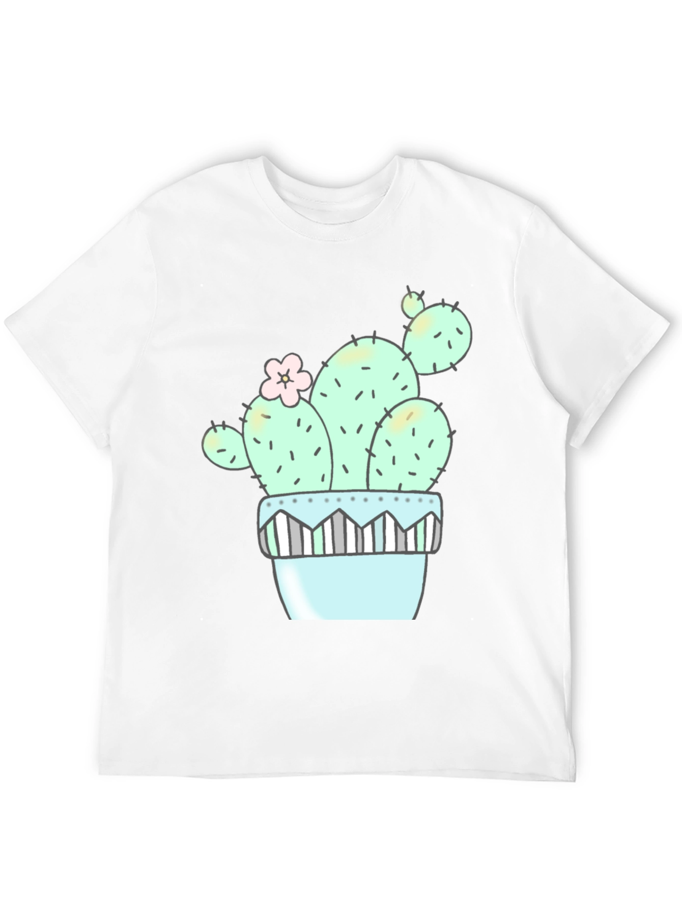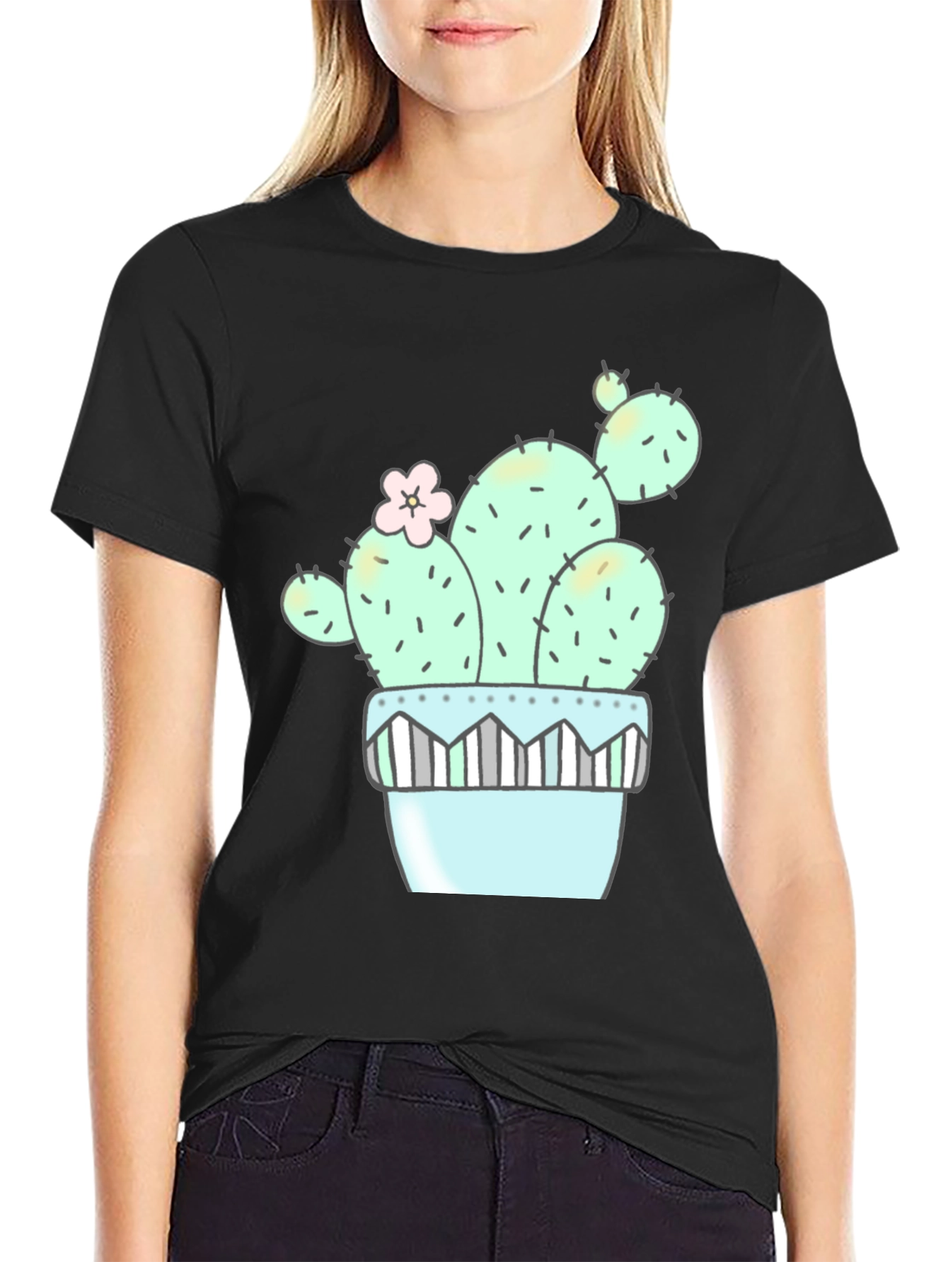 Show off your love for plants with this adorable cactus graphic tee! This classic black t-shirt features a charming cartoon-style cactus design potted in a pastel pot. The cactus is adorned with a delicate pink flower, adding a touch of sweetness to the design. Made from comfortable, breathable fabric, this unisex tee is perfect for everyday wear. Whether you're a plant enthusiast or just love quirky graphics, this shirt is sure to be a hit. Pair it with jeans or shorts for a casual and stylish look. Great gift for gardeners and nature lovers!
