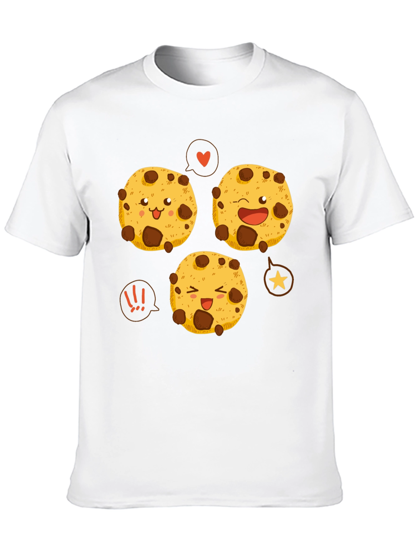 This black t-shirt features a playful design with three cartoon cookies. Each cookie has a different cheerful expression and is accompanied by a cute speech bubble. The vibrant yellow cookies contrast well against the black background, making the design pop. The t-shirt appears to be made of a soft, comfortable material, perfect for everyday wear. Ideal for cookie lovers and those who enjoy fun, eye-catching graphics. Great for casual outings, parties, or just lounging around in style. This tee is sure to bring a smile to anyone's face!