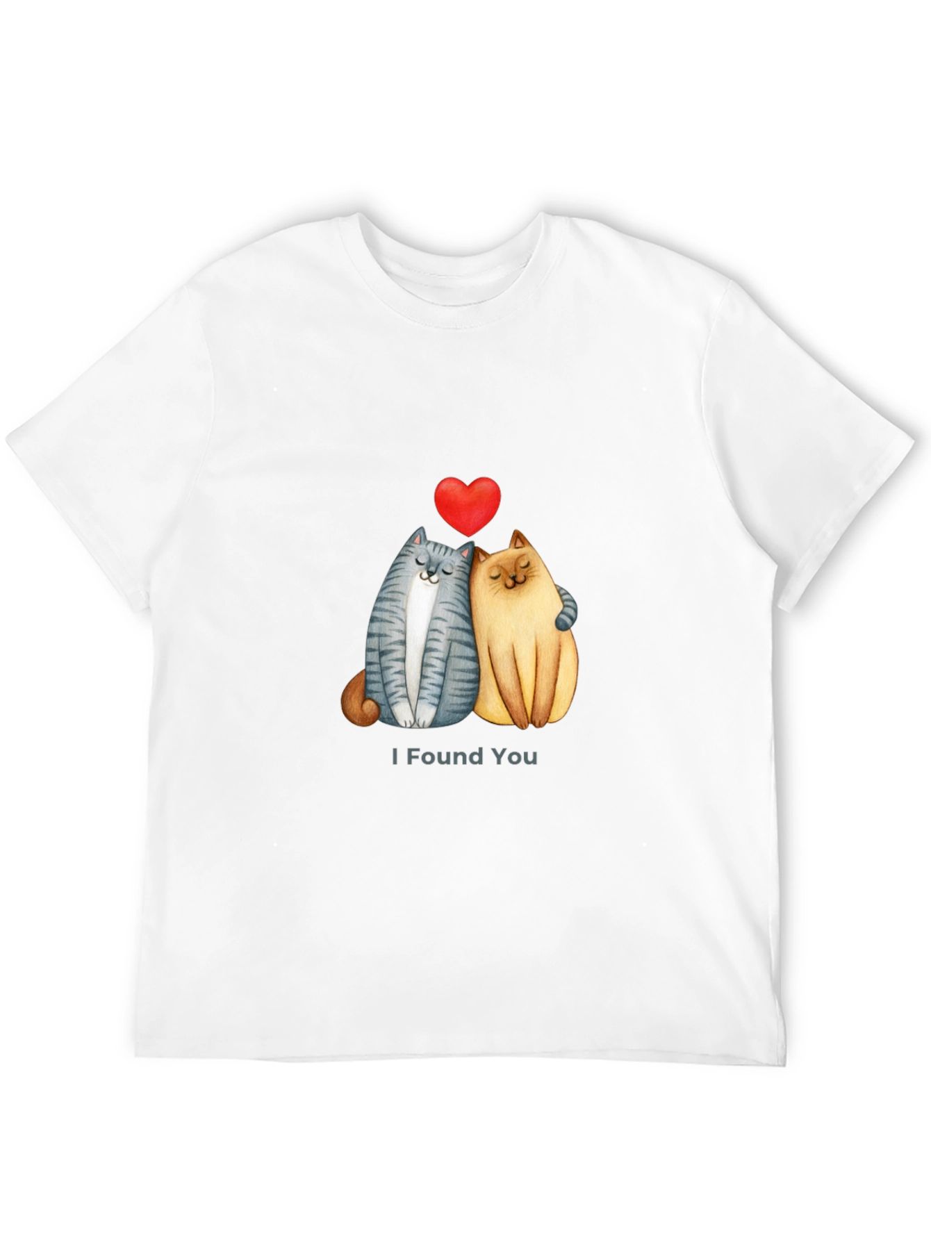 Show your love for cats and Valentine's Day with this adorable black t-shirt. Featuring two cute cartoon cats embracing under a red heart, accompanied by the words "I Found You," this shirt is perfect for expressing affection. Crafted from a comfortable material, it's ideal for everyday wear, casual outings, or Valentine's Day celebrations. Its unique design makes it a great conversation starter and a thoughtful gift for cat lovers. The black color provides a versatile backdrop for the vibrant graphic, ensuring it stands out in style.