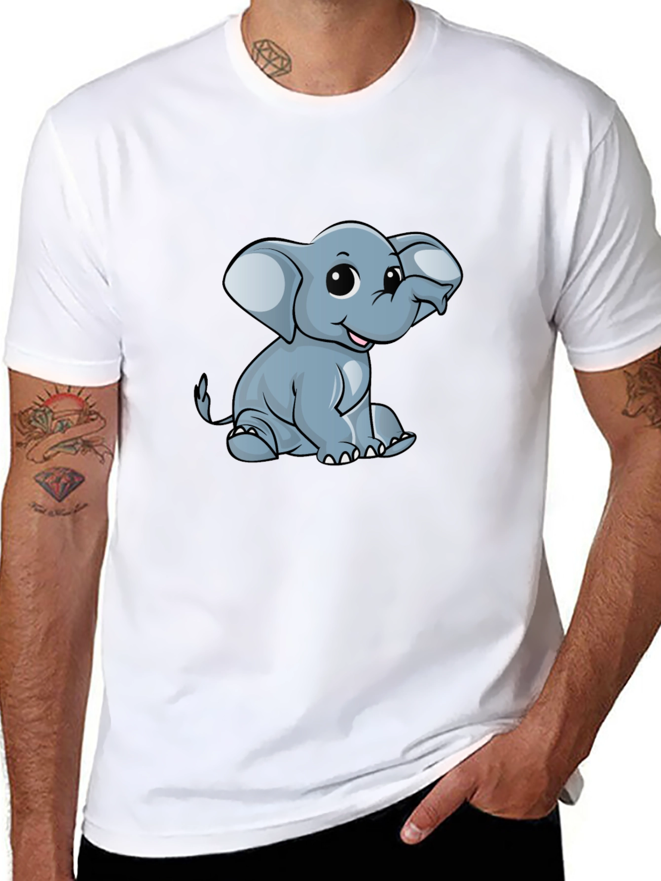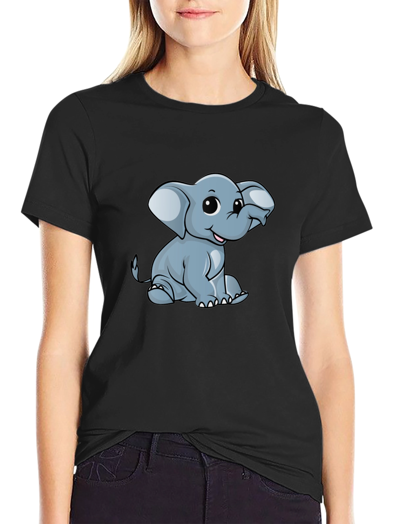 This stylish black t-shirt features an adorable cartoon elephant graphic, perfect for adding a playful touch to your everyday wardrobe. The elephant is depicted in a seated pose with oversized ears and a friendly expression. Made from what appears to be a soft, breathable cotton blend, this tee offers both comfort and style. The classic crew neck and short sleeves make it a versatile piece for casual wear. Pair it with jeans or shorts for a relaxed, easygoing look, ideal for casual outings, weekend activities, or simply lounging at home. A great choice for animal lovers and those who enjoy fun, quirky designs.