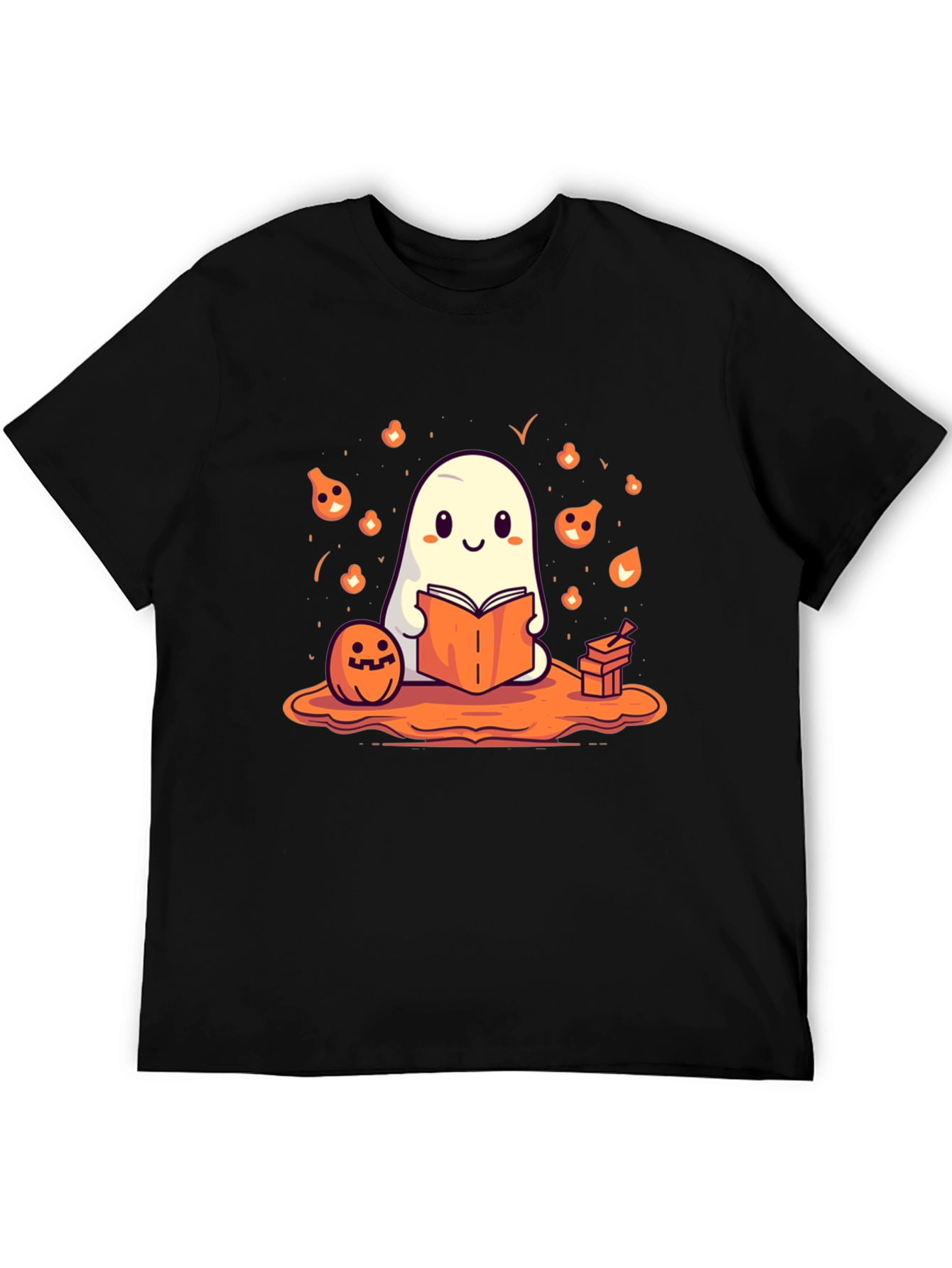 Get ready for Halloween with this adorable black t-shirt featuring a cute ghost engrossed in a book. The design showcases a cartoon ghost sitting amidst a patch of orange, with a small pumpkin friend nearby and ghostly flames floating around. Made from soft, breathable fabric, this shirt is comfortable enough for everyday wear and perfect for festive occasions. Its playful graphic adds a touch of spooky charm, making it an ideal choice for Halloween parties, trick-or-treating, or simply showing off your love for the holiday. A whimsical addition to any wardrobe!