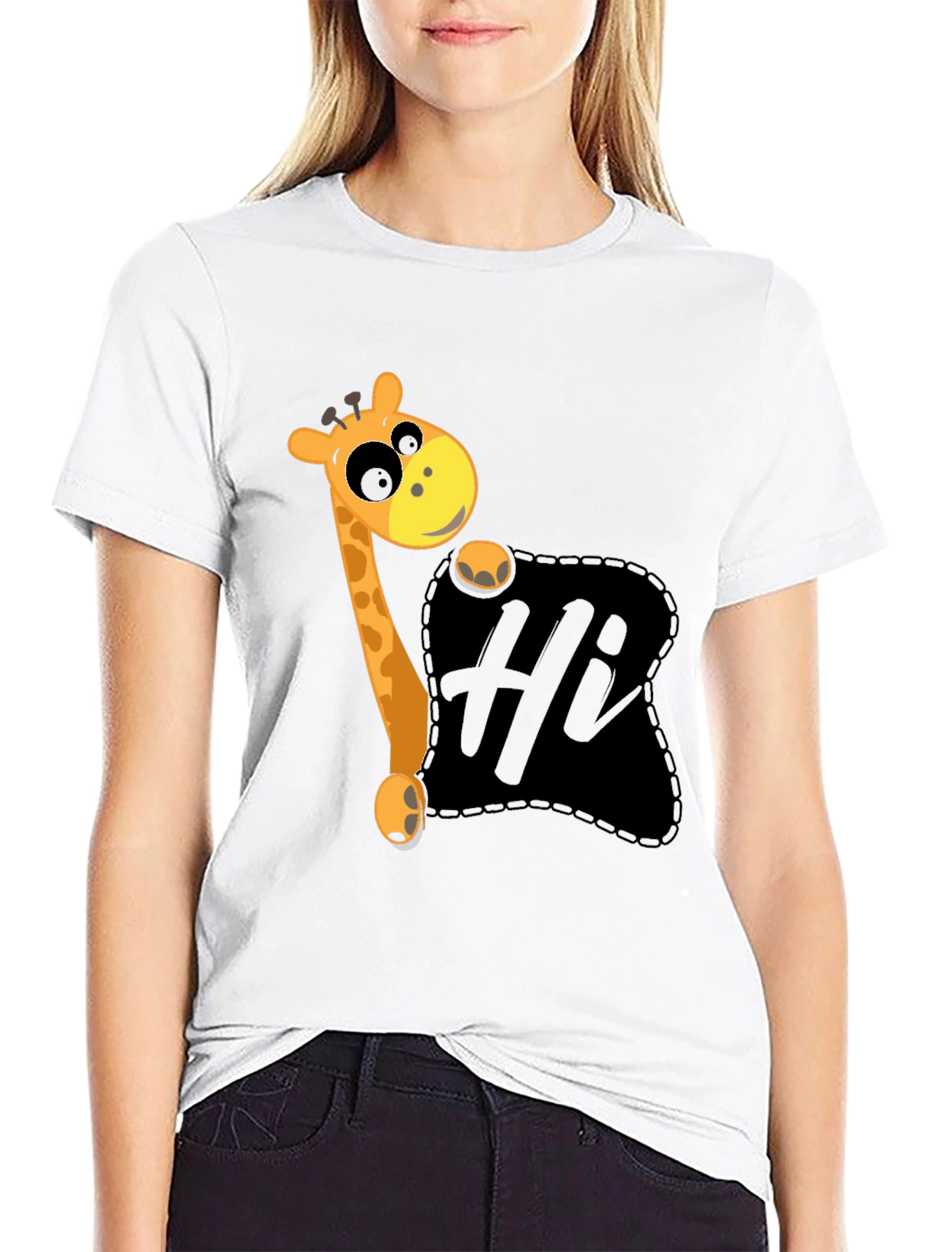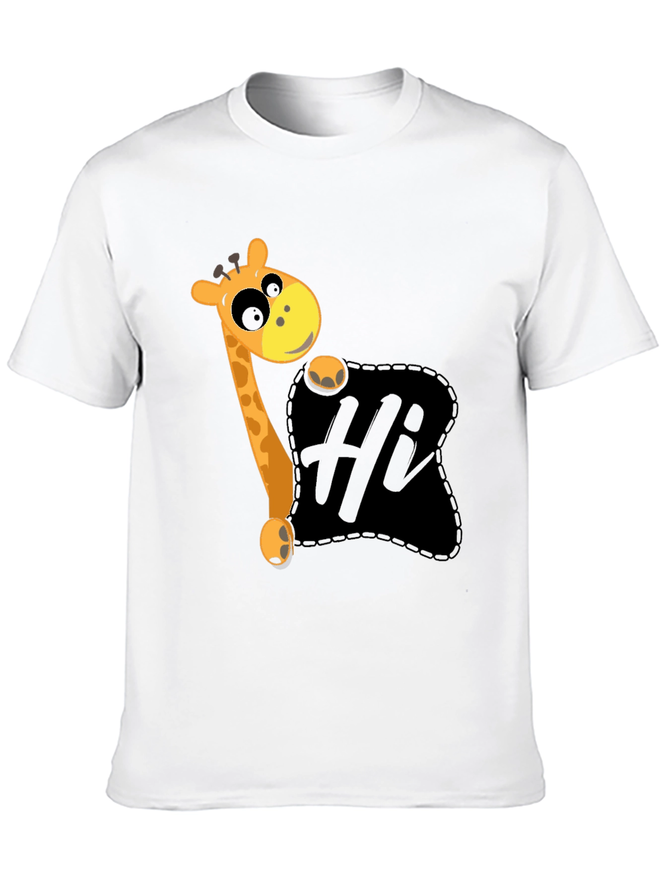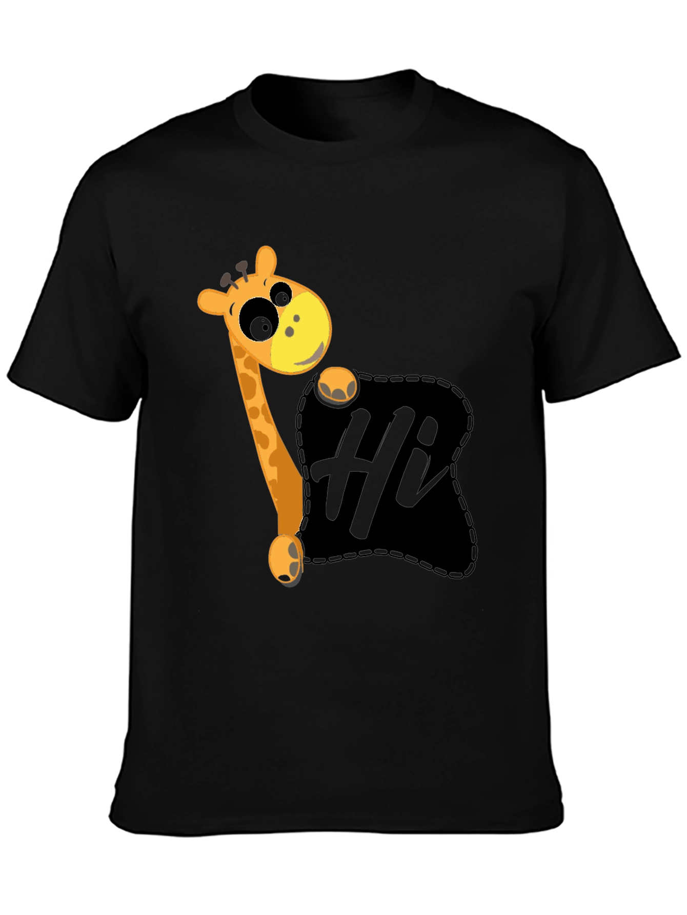 This black t-shirt features a playful graphic design of a cartoon giraffe peeking out from a dark pocket, waving a friendly 'Hi'. The design is whimsical and eye-catching, perfect for adding a touch of fun to your wardrobe. Made from a comfortable-looking fabric, this tee seems ideal for casual wear. It's a great conversation starter and a fun way to express your personality. Wear it to school, outings with friends, or simply while relaxing at home. This unique tee makes a delightful gift for giraffe lovers or anyone who enjoys quirky fashion.