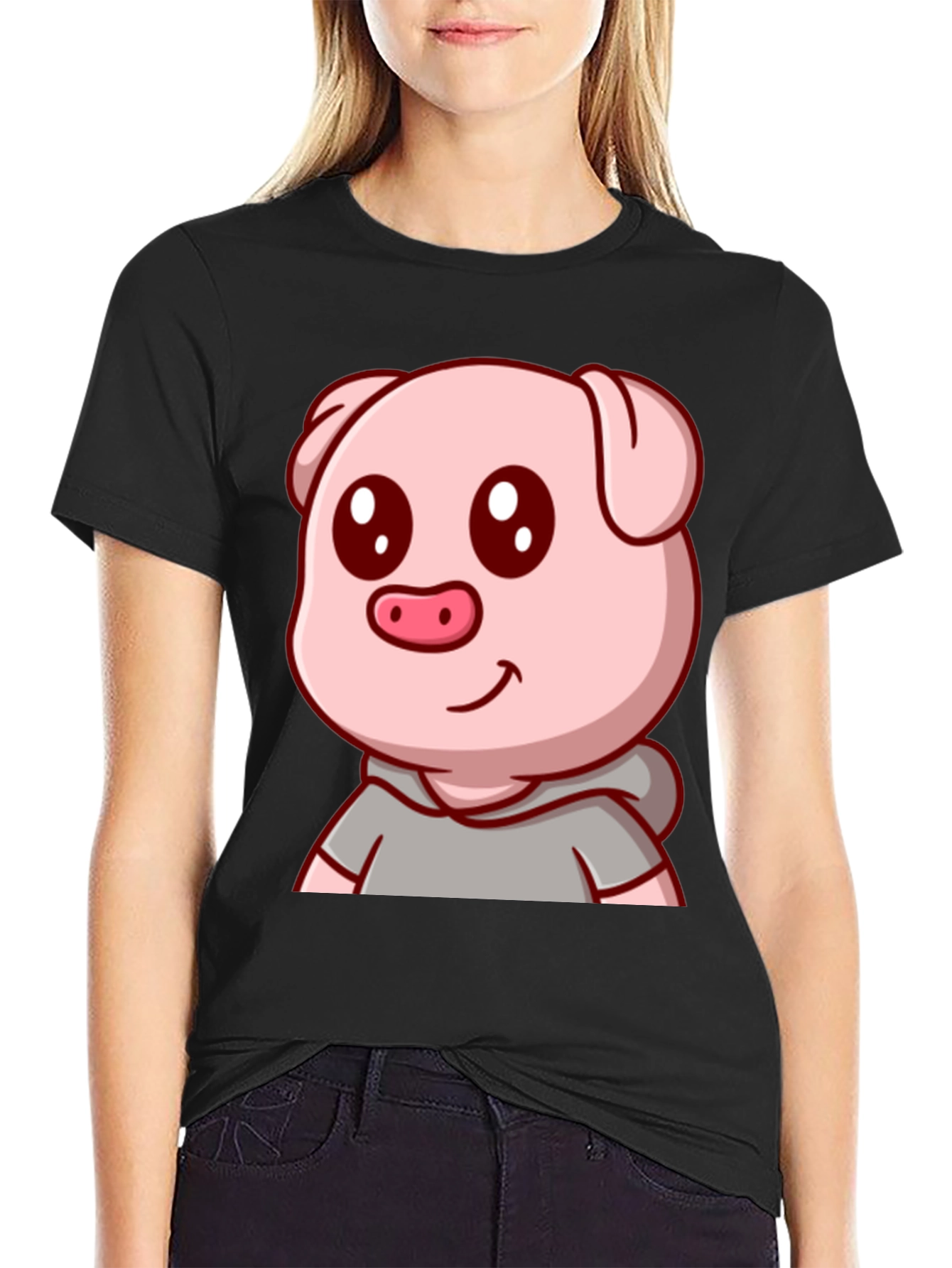 Show off your playful side with this adorable black t-shirt featuring a cartoon pig graphic. The design showcases a cheerful pink pig with endearing eyes, a sweet smile, and a stylish grey hoodie. Made from comfortable and breathable fabric, this unisex tee offers a relaxed fit that's perfect for everyday wear. Whether you're a fan of animals, cartoons, or simply want to add a touch of whimsy to your wardrobe, this t-shirt is an excellent choice. Ideal for casual outings, lounging at home, or as a fun gift for friends and family. Stand out with this unique and eye-catching design!