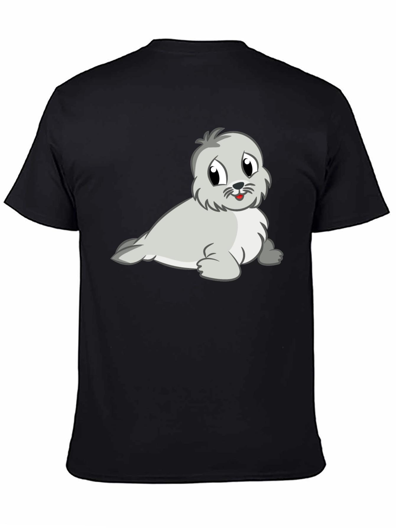 This charming black t-shirt features an adorable cartoon seal graphic, perfect for adding a touch of whimsy to your wardrobe. The seal, rendered in soft gray and white tones, has endearing eyes and a playful expression. Constructed from what appears to be a soft cotton blend, this tee promises both comfort and durability. The classic crew neck and short sleeve design make it versatile for casual wear, whether you're running errands, lounging at home, or meeting friends. The well-placed graphic ensures the design stands out without being overwhelming. This tee offers a relaxed fit that is both flattering and comfortable. Pair it with jeans, shorts, or a skirt for an effortlessly stylish look. A delightful and comfortable choice for anyone who loves animals and lighthearted fashion!