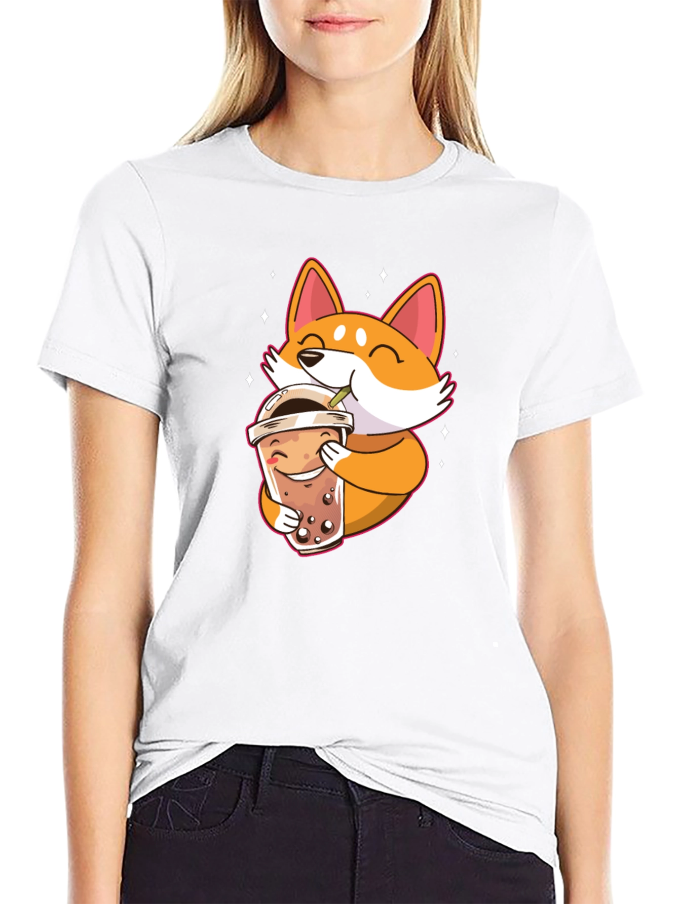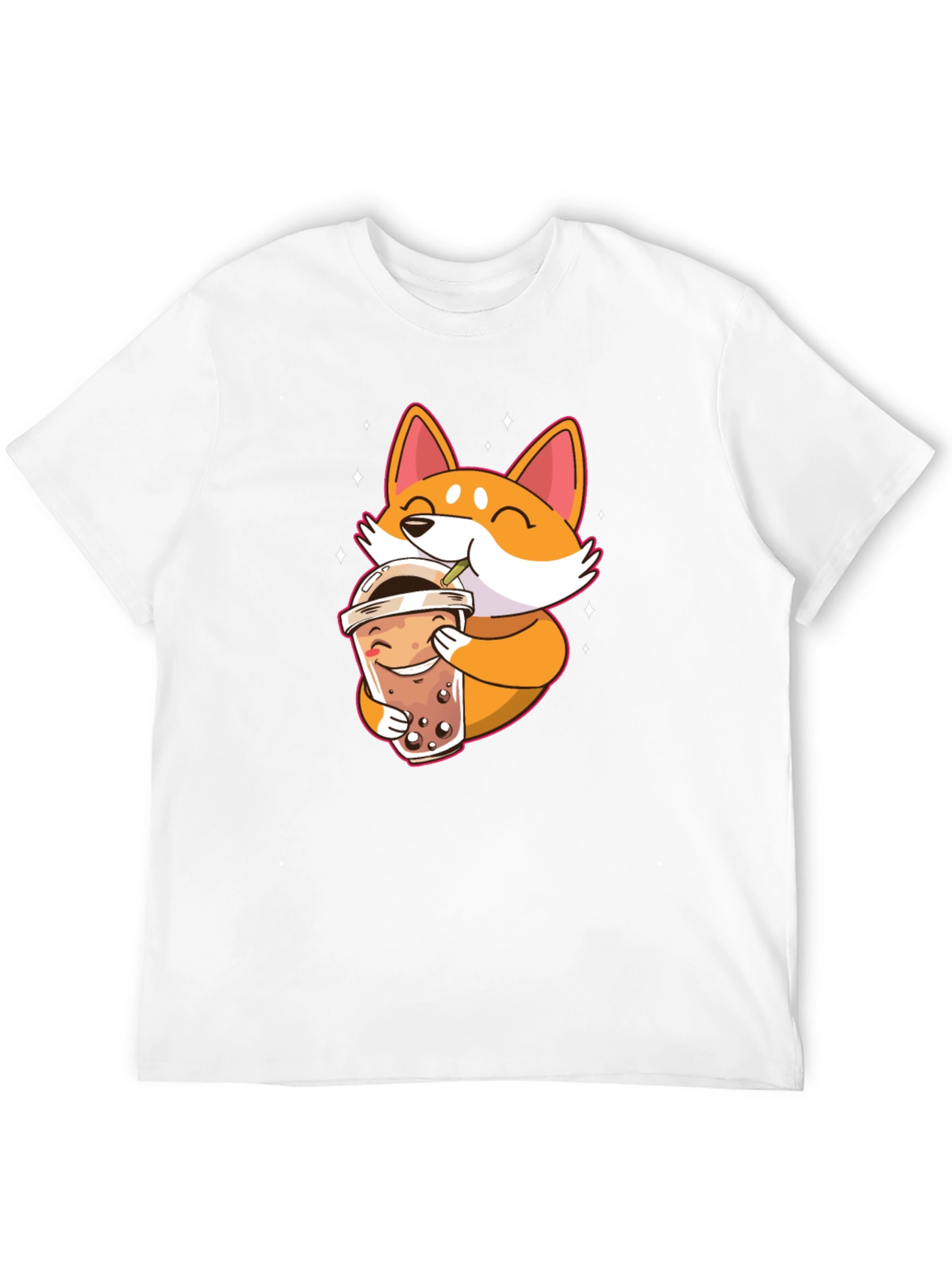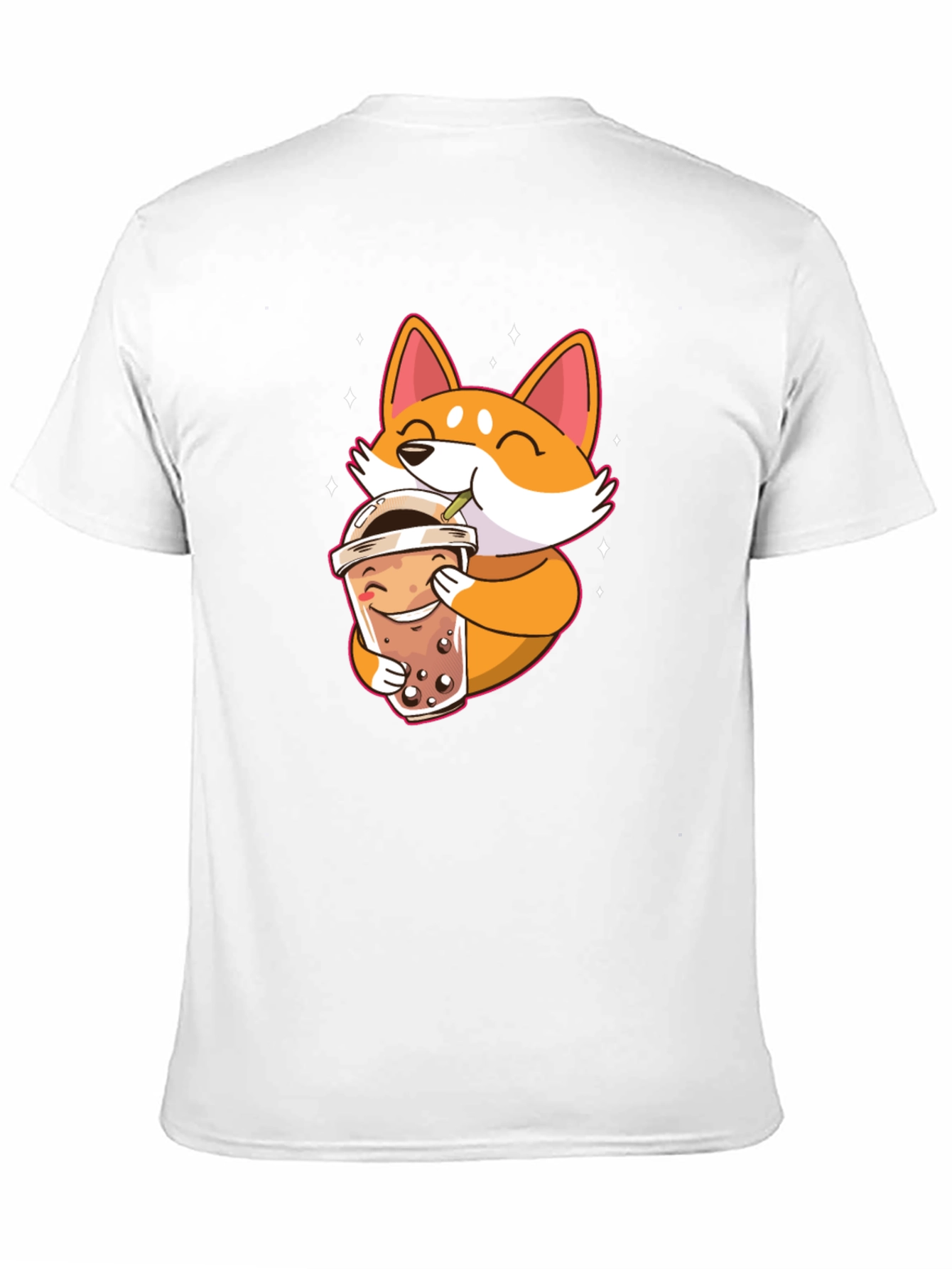 This black t-shirt features a charming graphic print of a cute, cartoon-style Shiba Inu dog enjoying a cup of boba tea. The design is vibrant, with the orange and white Shiba Inu standing out against the black background. The shirt is made from what appears to be a soft, comfortable fabric, perfect for everyday wear. Ideal for casual outings, lounging at home, or as a fun conversation starter. The t-shirt is a great addition to any wardrobe for those who love cute animals and boba tea! Available in various sizes.