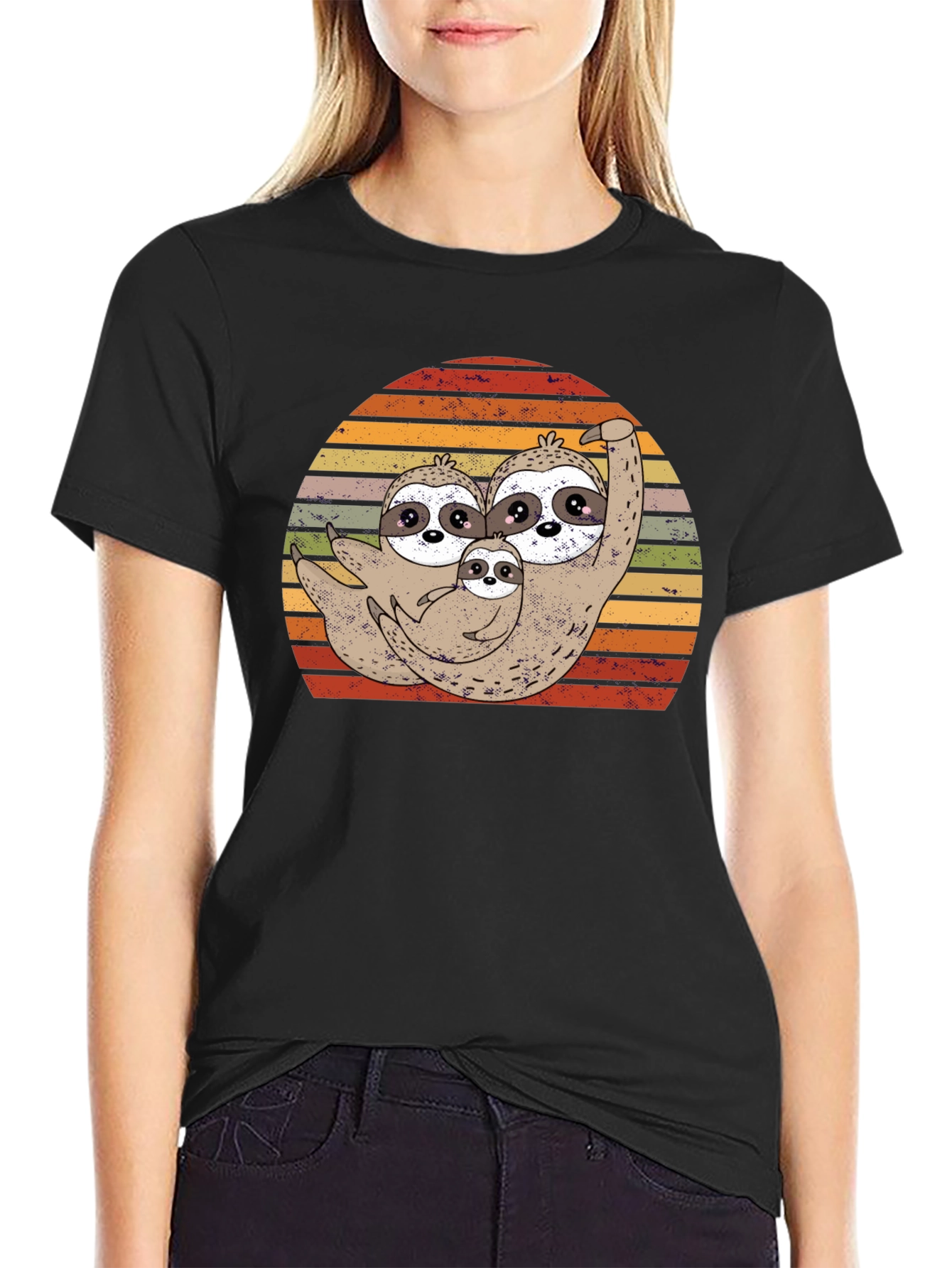 Show your love for sloths with this adorable black T-shirt. The design features a heartwarming illustration of a sloth family set against a vintage-style sunset backdrop. The cute cartoon sloths bring a playful and endearing touch to your wardrobe. Made from comfortable fabric, this tee is perfect for casual wear, lounging at home, or showing off your unique style. Express your love for wildlife and slow living with this charming sloth family T-shirt. A must-have for animal lovers and fans of quirky fashion!