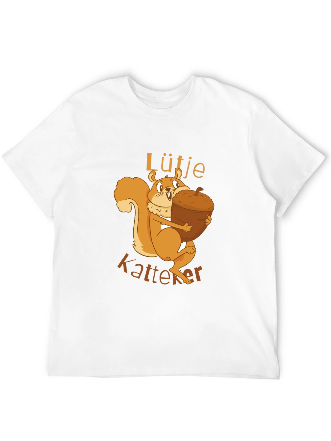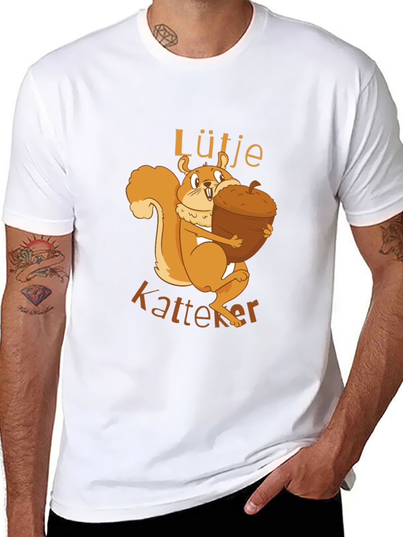 Show off your fun side with this unique t-shirt! Featuring a charming squirrel graphic hugging a large acorn, this black tee is sure to turn heads. The design includes the text "Lütje Katterker", adding a playful touch. Made from a comfortable, breathable fabric, this t-shirt is perfect for everyday wear, casual outings, or simply lounging at home. Its distinctive design also makes it a great conversation starter. A must-have for animal lovers and those with a quirky sense of style. Get yours today and showcase your fun-loving personality!