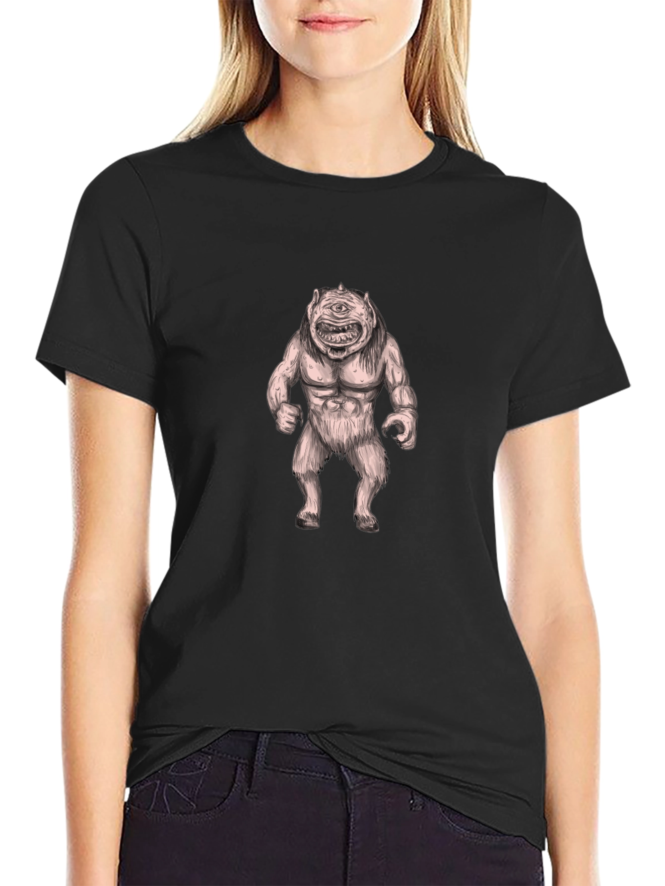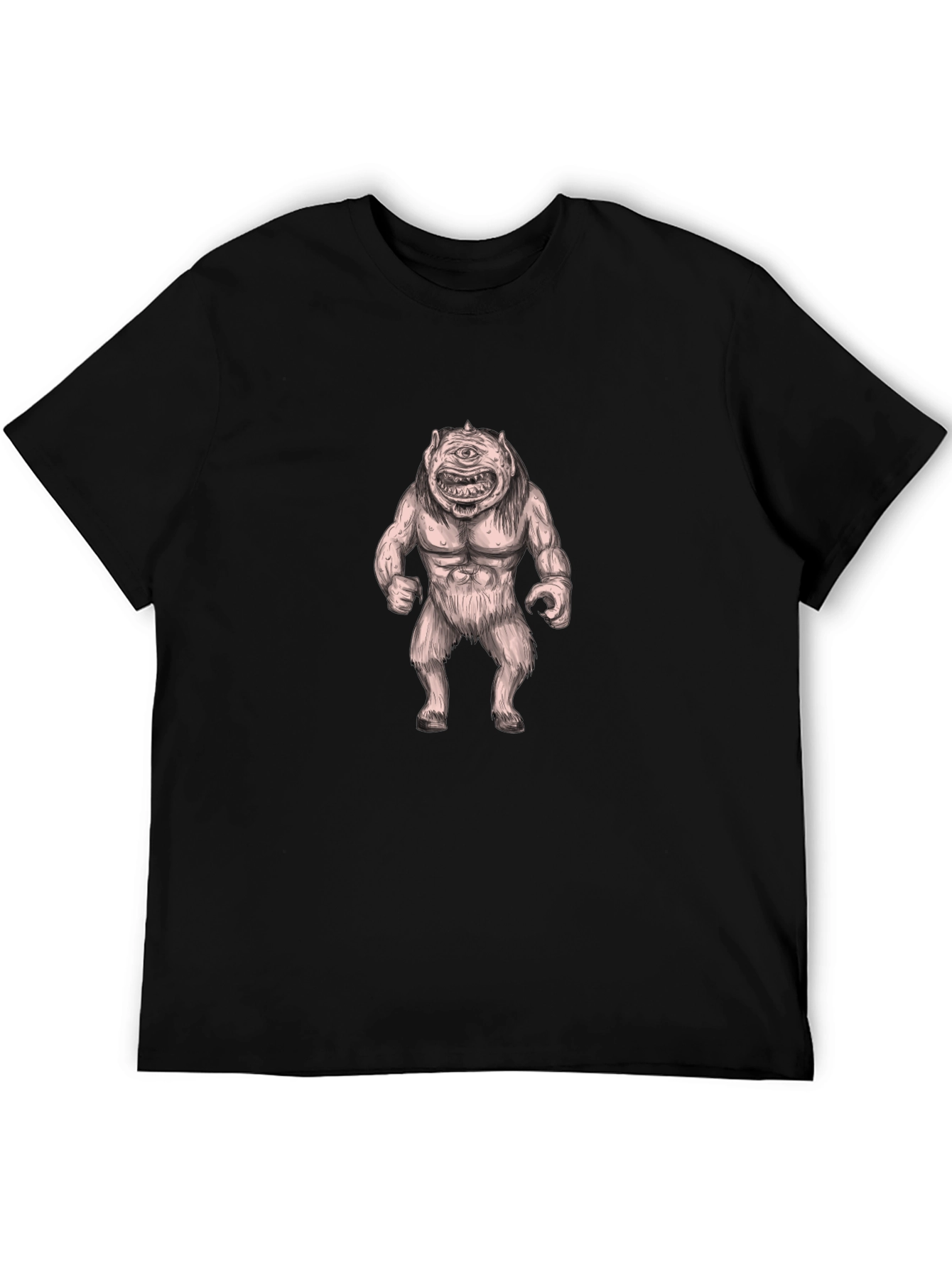 Unleash your inner monster with this striking black tee! Featuring a unique cyclops monster graphic, this shirt is sure to turn heads. The detailed design showcases a muscular, one-eyed creature, adding an edgy touch to your wardrobe. Made from comfortable cotton fabric, it's perfect for everyday wear. Whether you're hitting the streets or lounging at home, this tee provides a stylish and comfortable fit. Make a statement with this bold and expressive piece – a must-have for fans of fantasy and unique graphic designs. Express yourself!