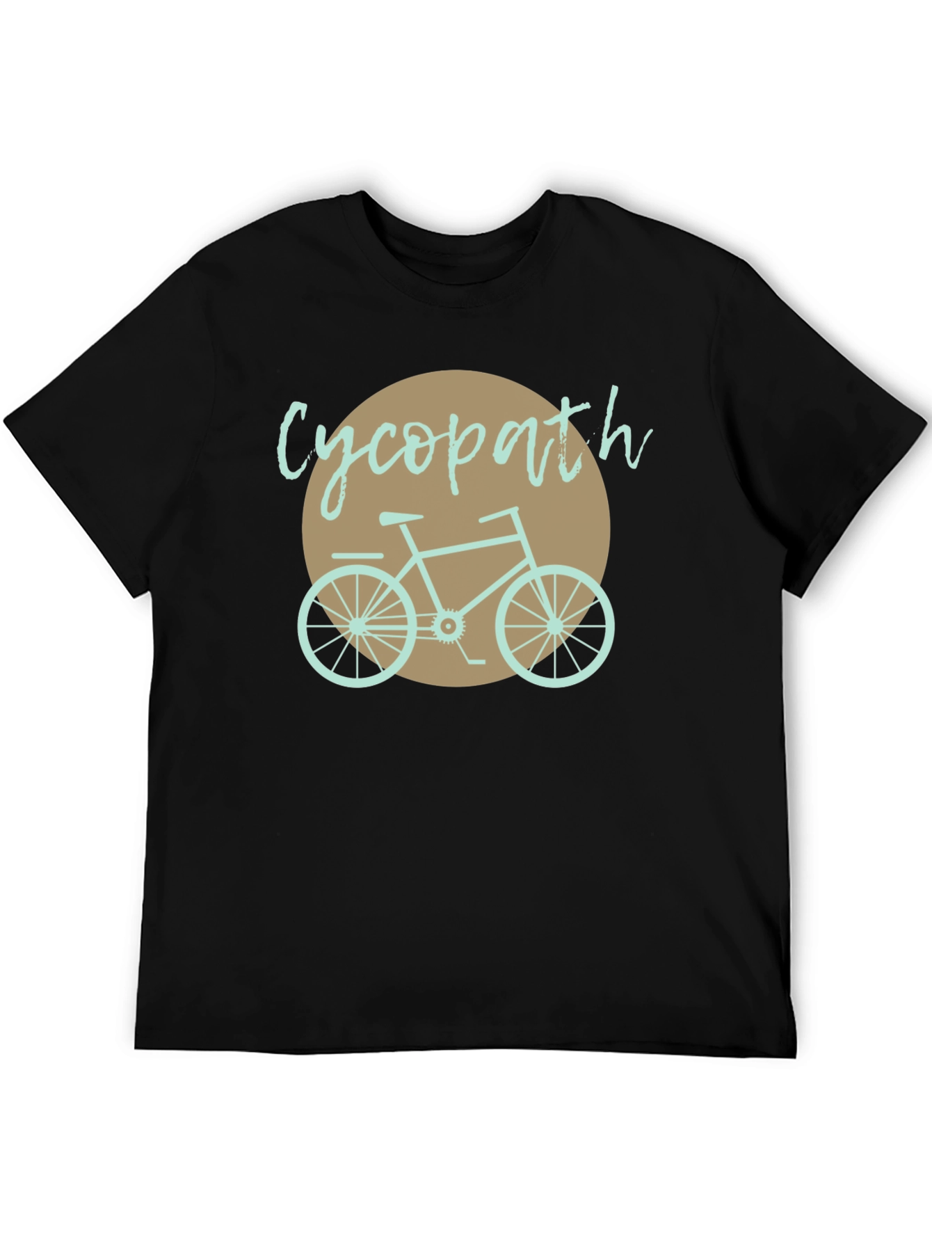 This black t-shirt features a playful design for cycling enthusiasts. A graphic shows a vintage-style bicycle against a light brown circular backdrop, with the word "Cycopath" written in a script font across the top. The relaxed fit and soft fabric make it comfortable for everyday wear. The t-shirt is a great conversation starter and shows off your passion for cycling. This tee is ideal for casual outings, bike rides, or as a fun gift for the cyclist in your life. Showcase your cycling enthusiasm with this unique piece.