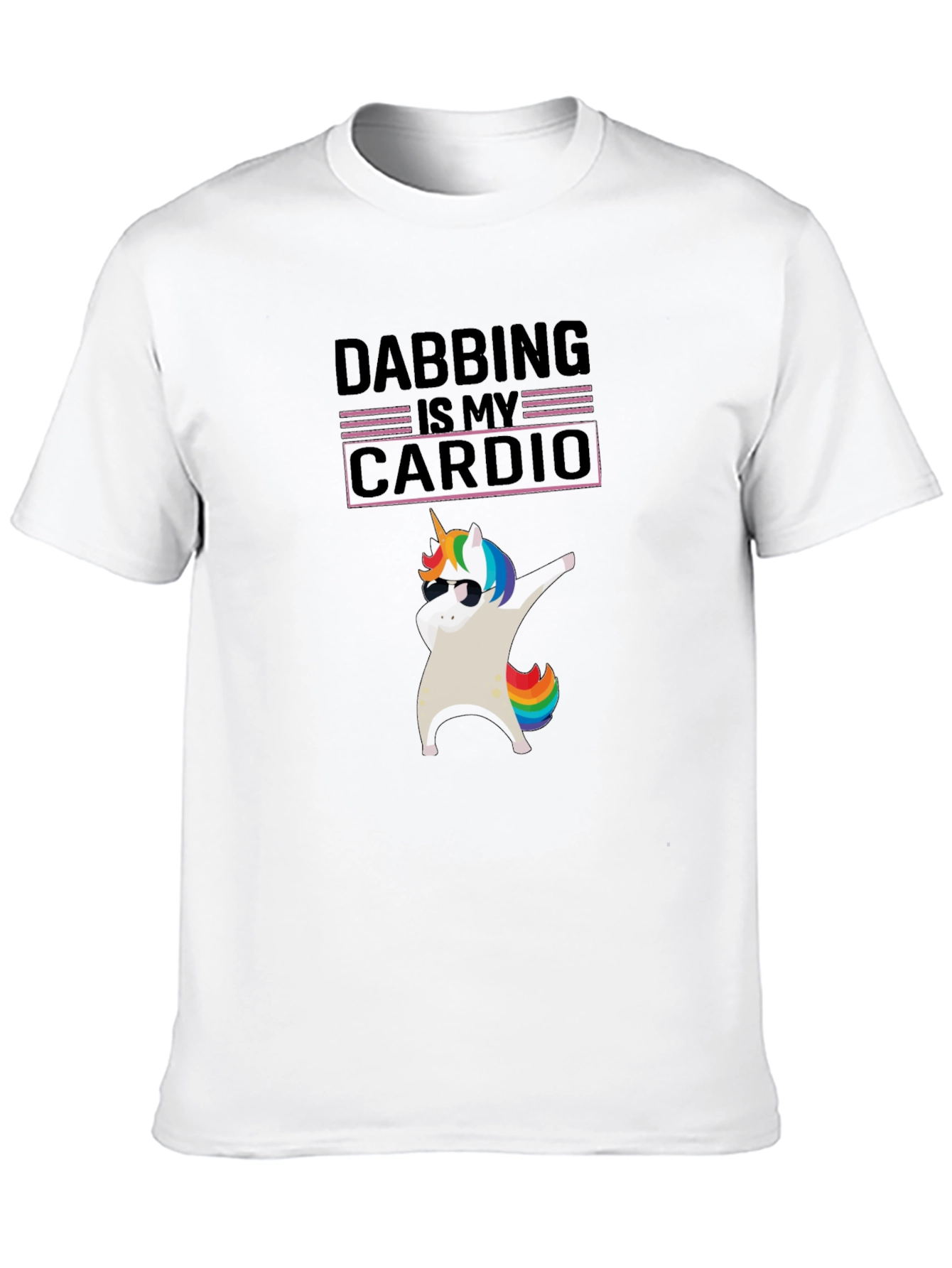 Express your fun side with this unique black t-shirt featuring a cool 'Dabbing Is My Cardio' design. The shirt showcases a playful unicorn graphic doing the iconic dab dance, complete with a rainbow mane and tail. Made from soft, breathable fabric, this tee ensures all-day comfort and style. Perfect for casual outings, gym sessions, or just lounging around, it's a great conversation starter. Stand out from the crowd and show off your quirky personality with this eye-catching t-shirt. Makes a fantastic gift for unicorn lovers and those with a sense of humor. Get yours today and let the dabbing begin!