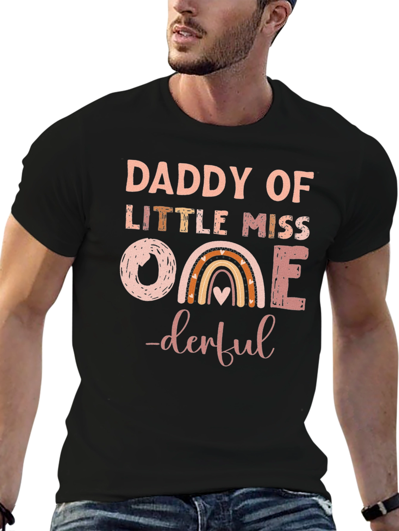 Celebrate your little girl's first birthday with this adorable t-shirt! This black tee features the phrase "Daddy of Little Miss ONE-derful" in a playful, layered font with a cute rainbow and heart detail. The design is printed in soft, muted colors, making it a stylish and heartwarming piece. Perfect for birthday parties, family photos, or everyday wear, this t-shirt is a great way for dad to show his love and pride. Made with comfortable materials for all-day wear, it's a unique and thoughtful gift for any father.