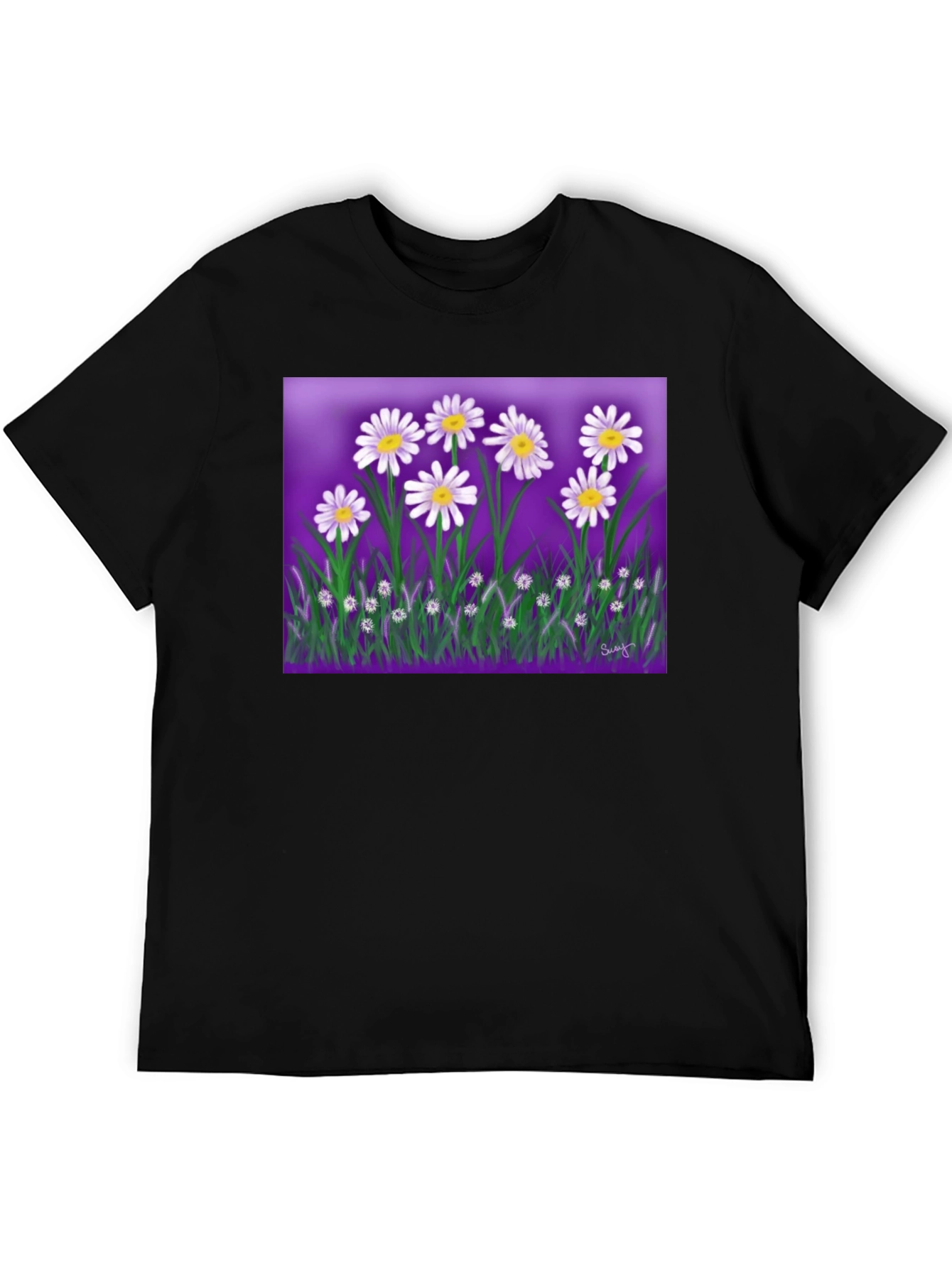 This stylish black t-shirt features a colorful and vibrant floral graphic design on the front. The graphic showcases a field of white daisies with yellow centers set against a purple backdrop, adding a touch of nature-inspired charm to your wardrobe. Made from soft and comfortable fabric, this tee is perfect for everyday wear. Pair it with jeans or shorts for a casual look, or dress it up with a blazer for a more polished ensemble. Ideal for anyone who loves floral patterns and wants to add a pop of color to their outfit.