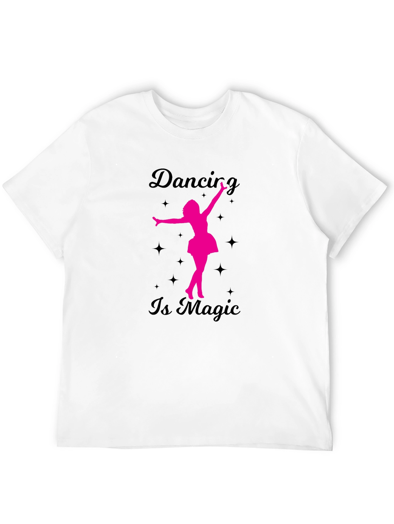 This eye-catching black t-shirt features a vibrant pink graphic that reads "Dancing is Magic", accompanied by a silhouette of a dancer. The design is adorned with sparkling star accents. Made from what appears to be a comfortable cotton blend, this tee offers both style and comfort. It's perfect for dance enthusiasts, performers, or anyone who appreciates a touch of magic in their wardrobe. Wear it to dance class, casual outings, or simply to express your love for dancing. This tee is sure to turn heads and spark conversations wherever you go.