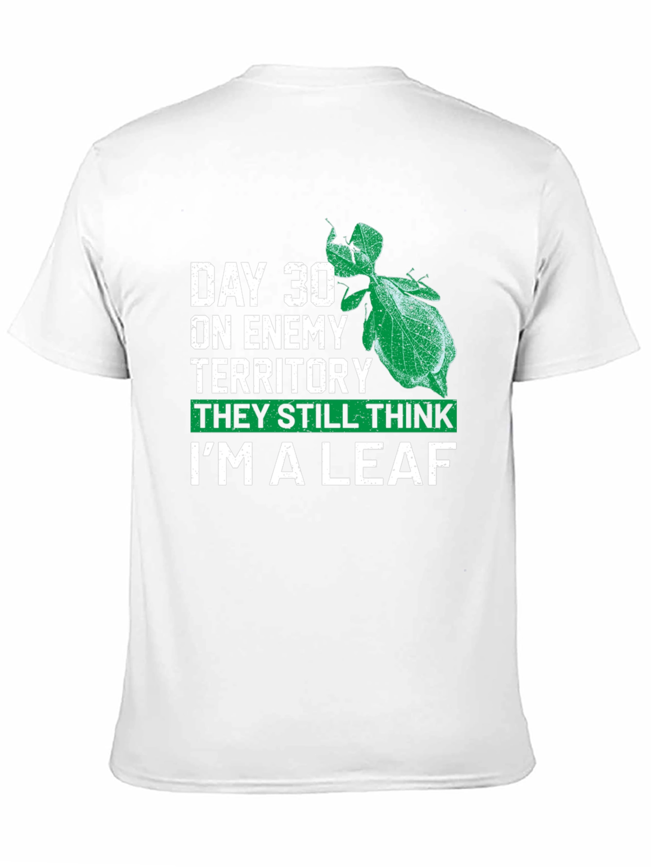 This black t-shirt features a humorous graphic design perfect for insect enthusiasts and fans of clever wordplay. The design includes the text "DAY 30 ON ENEMY TERRITORY THEY STILL THINK I'M A LEAF", with "THEY STILL THINK" highlighted in green to match the leaf bug graphic. The image shows a large, vivid green leaf insect. The shirt itself appears to be a comfortable, casual fit, suitable for everyday wear. Wear it to spark conversations and show off your unique sense of humor. This tee is a fun choice for casual outings, nature walks, or insect-themed events.